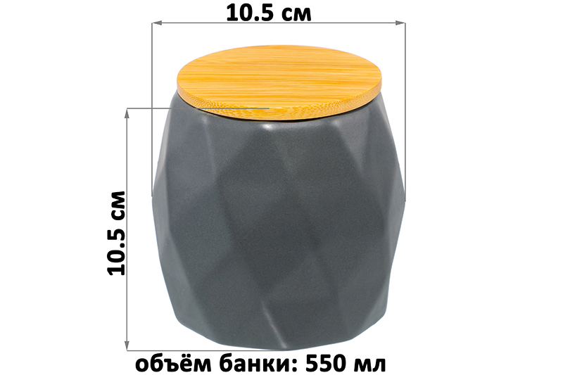 Банка от Elan Gallery предназначена для организации хранения продуктов на вашей кухне. Размер ёмкости – 10,5х10,5х10,5 см, объём – 550 мл. Выполнена из высококачественного фарфора. Он не впитывает цвет продуктов и легко отмывается, благодаря чему надолго сохранит свой привлекательный вид. Поверхность имеет необычный гранёный рельеф и элегантный графитовый цвет. Крышка выполнена из натурального бамбука и оснащена силиконовым уплотнителем. Изделие отлично подойдёт для хранения сыпучих продуктов: сахара и соли, чая и кофе, приправ и специй. Храните в баночке ягоды, орехи и сухофрукты. Заполните её леденцами, конфетами или небольшим печеньем. Подайте баночку к столу, чтобы идеально дополнить чайную сервировку! Герметичная деревянная крышка защитит ваши продукты от попадания грязи и пыли. Баночка элегантного графитового цвета впишется в любой интерьер и позволит организовать хранение даже на открытых полках. Не рекомендуется применять абразивные моющие средства. Без крышки подходит для использования в микроволновой печи и посудомоечной машине. Бамбук нельзя замачивать! Поставляется в дизайнерской картонной коробке – благодаря ей вам не потребуется дополнительная подарочная упаковка. Это идеальный подарок для хозяйки, ценящей не только практичность, но и стиль. В ассортименте бренда Элан Галерея представлены банки для хранения на любой вкус. Соберите целый набор для эстетичного хранения продуктов на вашей кухне!