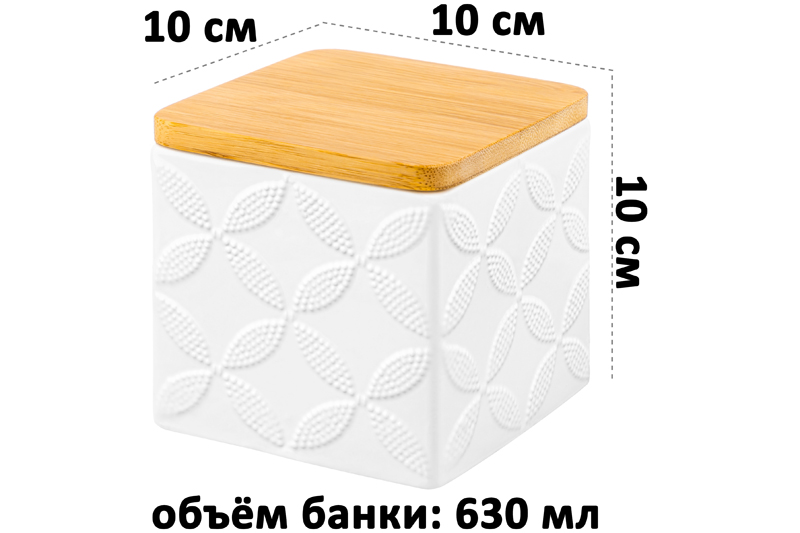 Банка для хранения серии "Узоры" на 630 мл подойдет для сыпучих продуктов и круп, муки, сахара, приправ и самых разных мелочей. Баночка выполнена из высококачественной керамики и украшена декоративными рельефными узорами. Крышка емкости выполнена из натурального бамбука и прочно сидит благодаря силиконовому уплотнителю. Размер контейнера 10х10х10 см. Нельзя использовать в СВЧ и ПММ. Крышку нельзя замачивать. Набор поставляется в яркой картонной упаковке. Керамическая банка из серии посуды "Узоры" сможет стать настоящим украшением кухни или приятным подарком для ваших родных и близких!