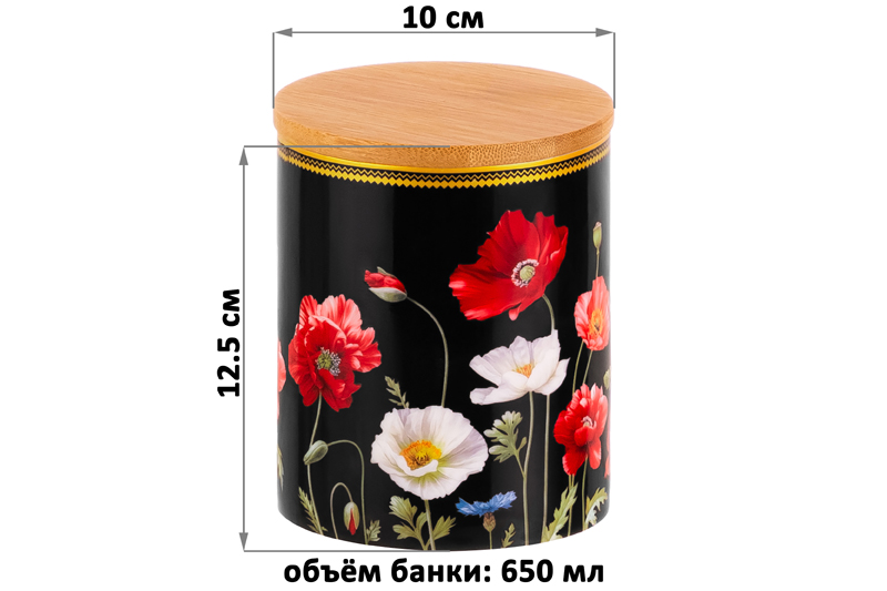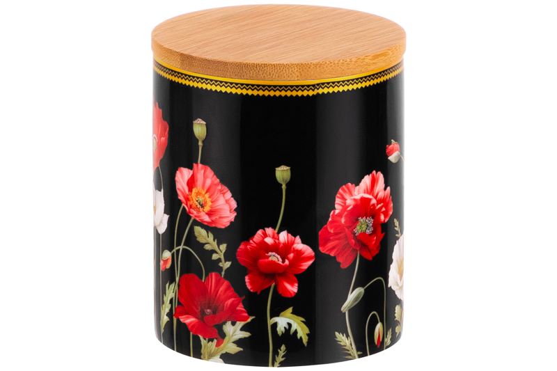 Банка д/хранения 650 мл 10*10*12,5 см "Маки на черном" с дерев. крышкой с силик.упл. NEW BONE CHINA