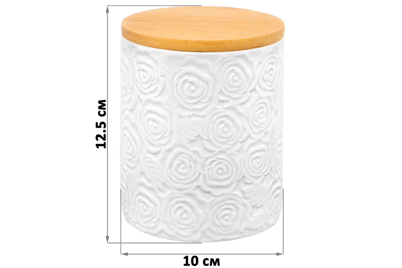 Банка из серии «Розы» от Elan Gallery послужит для организации хранения сыпучих продуктов на вашей кухне. Размер ёмкости – 10х10х12,5 см, объём – 650 мл. Выполнена из высококачественного белого фарфора. Он не впитывает цвет продуктов и легко отмывается, благодаря чему надолго сохраняет свою белизну. Поверхность изделия украшают рельефные узоры в виде пышных бутонов роз. Крышка выполнена из натурального бамбука и оснащена силиконовым уплотнителем. Ёмкость подойдёт для хранения разнообразных сыпучих продуктов. Заполните её сахаром и солью, специями и приправами, чтобы во время приготовления и приёма пищи всё необходимое было под рукой. Засыпьте внутрь чай или кофе, чтобы в любой момент заварить свежий напиток. Храните в ней крупы, ягоды, орехи и сухофрукты. Заполните контейнер сладостями и закусками: конфетами, леденцами, пряниками или печеньем. Подайте баночку к столу, чтобы идеально дополнить чайную сервировку! Герметичная бамбуковая крышечка защитит ваши продукты от попадания грязи и пыли. Не рекомендуется применять абразивные моющие средства. Без бамбуковой крышки подходит для использования в посудомоечной машине и микроволновой печи. Бамбук нельзя замачивать! Поставляется в дизайнерской картонной коробке – благодаря ей вам не потребуется дополнительная подарочная упаковка. Фарфоровая сервировочная посуда будет оригинальным подарком для хозяйки, ценящей не только практичность, но и привлекательность. Серия «Розы» от бренда Элан Галерея станет украшением любого кухонного инвентаря и позволит собрать красивый сервиз в едином стиле!