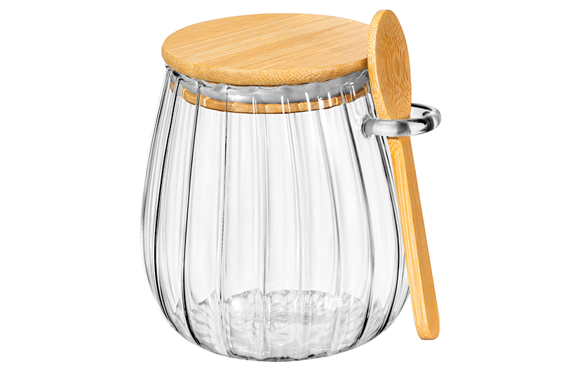 Банка с бамбуковыми крышкой и ложкой в комплекте от бренда Elan Gallery выполнена из боросиликатного стекла и украшена рельефным узором в виде вертикальных полосок. Крышечка из натурального бамбука оснащена силиконовым уплотнителем, что обеспечивает её герметичность. На стеночке ёмкости есть специальный держатель в виде колечка, который позволяет удобно хранить ложку из натурального бамбука, которая поставляется в комплекте. Размер изделия – 11х11х11,5 см, объём – 680 мл. Высота без крышки – 10,8 см. Прозрачная баночка подойдёт для хранения мёда, варенья, сахара и соли. Можно использовать её как ёмкость для чая, кофе и других сыпучих продуктов. Декоративная баночка станет гармоничным дополнением при сервировке вашего стола как в будни, так и на праздник. Красивый дизайн позволит использовать её не только для хранения продуктов, но и для подачи на стол. Положите в неё икру, чтобы удивить гостей изящной сервировкой. Стеклянную ёмкость с крышечкой можно использовать не только как сахарницу и икорницу, но и для специй и приправ. Это позволит держать под рукой всё необходимое во время приготовления и приёма пищи. На даче медовница будет незаменимой для семейного чаепития, а также подойдёт для подачи джема. Не рекомендуется применять абразивные моющие средства. Без крышки и ложки можно использовать в посудомоечной машине и микроволновой печи. Бамбук запрещено замачивать. Поставляется в картонной упаковке. Красивая посуда – это отличный подарок на любой праздник. Стеклянный бочонок станет многофункциональным дополнением вашего кухонного инвентаря и настоящим украшением интерьера!