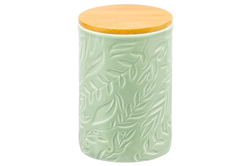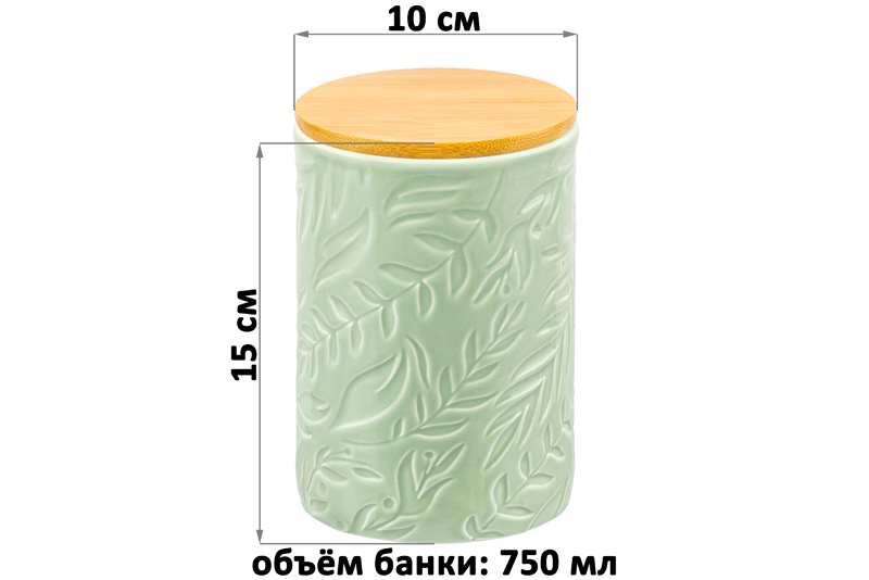 Банка от Elan Gallery предназначена для организации хранения продуктов на вашей кухне. Размер ёмкости – 10х10х15 см, объём – 750 мл. Выполнена из керамики и имеет светло-зелёный цвет, поверхность украшена рельефным лиственным узором. Крышка выполнена из натурального бамбука и оснащена силиконовым уплотнителем. Изделие отлично подойдёт для хранения сыпучих продуктов: сахара и соли, чая и кофе, приправ и специй. Храните в баночке ягоды, орехи и сухофрукты. Заполните её любимыми сладостями: леденцами, конфетами или печеньем. Подайте к столу, чтобы идеально дополнить чайную сервировку! Герметичная деревянная крышечка защитит ваши продукты от попадания грязи и пыли. Коллекция из трёх баночек нежных природных цветов впишется в любой интерьер и позволит организовать хранение даже на открытых полках. Не рекомендуется применять абразивные моющие средства. Не подходит для использования в микроволновой печи. Без бамбуковой крышки подходит для посудомоечной машины. Бамбук нельзя замачивать! Поставляется в дизайнерской картонной коробке – благодаря ей вам не потребуется дополнительная подарочная упаковка. Это идеальный подарок для хозяйки, ценящей не только практичность, но и стиль. В ассортименте бренда Элан Галерея представлены банки для хранения на любой вкус. Соберите целый набор кухонных контейнеров для эстетичного хранения продуктов на вашей кухне!