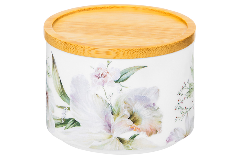 Банка с бамбуковой крышкой из серии "Корнелия" от Elan Gallery послужит для организации хранения продуктов на вашей кухне. Размер ёмкости – 9,3х9,3х7 см, объём – 250 мл. Высота без крышки – 6 см. Изготовлена из фарфора. За счёт гладкости стенок фарфоровая посуда легко отмывается, поэтому сохраняет привлекательный внешний вид и практична в использовании. Поверхность изделия овивают обворожительные белые пионы. Они выполнены в манере, вдохновлённой акварельным рисунком. Крышка выполнена из натурального бамбука и оснащена силиконовым уплотнителем. Ёмкость подойдёт для хранения разнообразных сыпучих продуктов. Заполните её сахаром и солью, специями и приправами, чтобы во время приготовления и приёма пищи всё необходимое было под рукой. Храните в ней ягоды, орехи и сухофрукты. Заполните контейнер закусками или сладостями, например, вареньем или мёдом. Послужит в роли маленькой сервировочной мисочки для соусов и джема. Подайте баночку к столу, чтобы идеально дополнить чайную сервировку. Герметичная бамбуковая крышечка предотвратит попадание пыли и грязи. Без крышки фарфоровое изделие можно использовать в качестве жюльенницы или рамекина – формы для запекания порционных блюд и десертов. Порадуйте близких творожной запеканкой, традиционным жюльеном или крем-брюле! Не рекомендуется применять абразивные моющие средства. Без бамбуковой крышки подходит для использования в посудомоечной машине, микроволновой печи и духовом шкафу при температуре до 230 градусов. Бамбук нельзя замачивать! Поставляется в дизайнерской картонной коробке – благодаря ей вам не потребуется дополнительная подарочная упаковка. Фарфоровая сервировочная посуда станет приятным подарком на любой праздник. Серия "Корнелия" от бренда Элан Галерея добавит вашему кухонному инвентарю лёгкости и элегантности, преобразив любую сервировку!