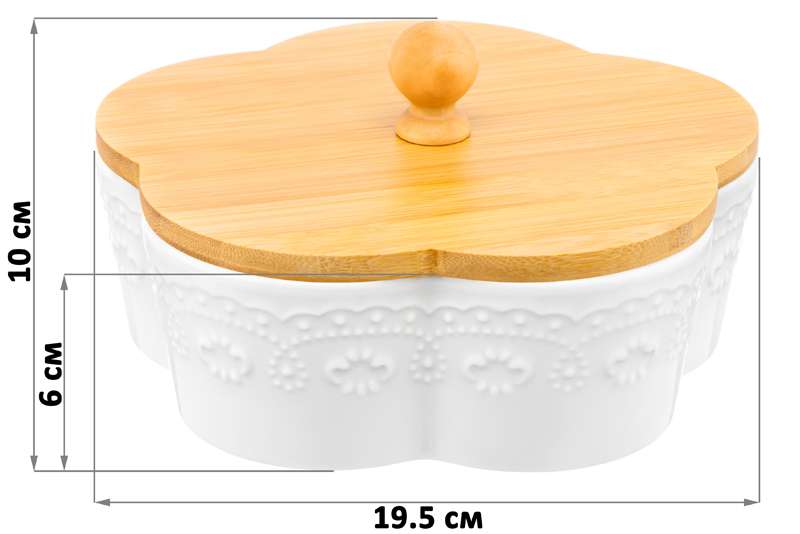 Банка для печенья из серии «Белый узор» предназначена для эстетичной сервировки вашего стола. Размер изделия – 19,5х19,5х10 см, объём – 900 мл. Выполнена из высококачественного белого фарфора. Он не впитывает цвет продуктов и легко отмывается, благодаря чему надолго сохраняет свою белизну. Поверхность изделия украшает рельефный узор, напоминающий изысканную вышивку. Красивая ёмкость в форме цветка станет не только функциональным, но и эстетичным дополнением вашего кухонного инвентаря. Наполните баночку любимым печеньем: бисквитным, сахарным или творожным. Послужит в качестве конфетницы – сложите в неё конфеты, шоколад, маленькие пирожные, пряники или любые другие сладости и выпечку. Наполните десертную вазочку большой порцией мороженого или разными десертами, чтобы разделить угощение с семьёй или друзьями. Используйте для подачи закусок: ягод, орехов, кусочков сыра или фруктов. Заполните дольками лимона, чтобы добавлять их в чай. Подойдёт для хранения сыпучих продуктов: кофе, сахара и соли, специй и приправ. Компактный контейнер удобно хранить в шкафчиках и на полках. Крышка сервировочной баночки имеет свободную посадку, чтобы её было легко и быстро открывать. Она достаточно герметична, чтобы обеспечить сохранность продуктов. Стильный и лаконичный дизайн впишет изделие в интерьер любой кухни, столовой или гостиной. Не рекомендуется применять абразивные моющие средства. Без бамбуковой крышки подходит для использования в посудомоечной машине и микроволновой печи. Бамбук нельзя замачивать! Поставляется в дизайнерской картонной коробке – благодаря ей вам не потребуется дополнительная подарочная упаковка. Фарфоровая сервировочная посуда будет оригинальным подарком для хозяйки, ценящей не только практичность, но и привлекательность. Серия «Белый узор» от бренда Элан Галерея станет украшением любого кухонного инвентаря и позволит собрать красивый сервиз в едином стиле!