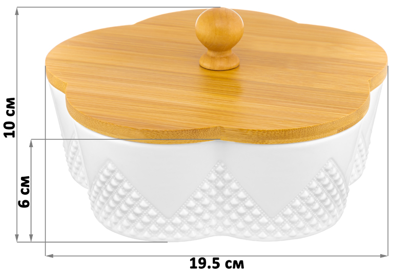 Банка для печенья из серии «Ромбики» предназначена для эстетичной сервировки вашего стола. Размер изделия – 19,5х19,5х10 см, объём – 900 мл. Выполнена из высококачественного белого фарфора в форме цветка и украшена рельефным геометрическим узором. Крышка выполнена из натурального бамбука. Фарфор легко отмывается и не впитывает цвет продуктов, благодаря чему надолго сохранит свою белизну. Красивая ёмкость станет не только функциональным, но и эстетичным дополнением вашего кухонного инвентаря. Наполните баночку любимым печеньем: бисквитным, сахарным или творожным. Послужит в качестве конфетницы: сложите в неё конфеты, шоколад, маленькие пирожные, пряники или любые другие сладости и выпечку. Наполните десертную вазочку большой порцией мороженного или разными десертами, чтобы разделить угощение с семьёй или друзьями. Используйте для подачи закусок: ягод, орехов, кусочков сыра или фруктов. Заполните дольками лимона, чтобы добавлять их в чай. Подойдёт для хранения сыпучих продуктов: кофе, сахара и соли, специй и приправ. Компактный контейнер удобно хранить в шкафчиках и на полках. Крышка сервировочной баночки имеет свободную посадку, чтобы вы могли легко и быстро открывать её. Она достаточно герметична, чтобы обеспечить сохранность продуктов. Благодаря стильному и лаконичному дизайну изделие гармонично впишется в интерьер любой кухни. Не рекомендуется применять абразивные моющие средства. Без бамбуковой крышки подходит для использования в посудомоечной машине и микроволновой печи. Бамбук нельзя замачивать. Поставляется в дизайнерской картонной коробке – благодаря ей вам не потребуется дополнительная подарочная упаковка. Посуда из серии «Ромбики» станет отличным подарком для хозяйки, ценящей не только практичность, но и стиль, и поможет собрать сервиз в едином стиле.