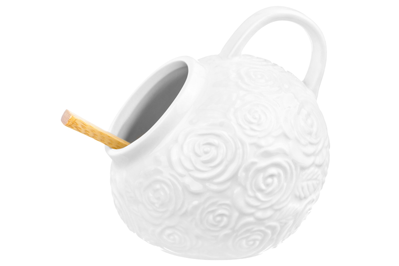 Банка из серии «Розы» от Elan Gallery послужит для организации хранения продуктов на вашей кухне. Размер ёмкости – 10х10х10,5 см, объём – 180 мл. Выполнена из высококачественного белого фарфора. Он не впитывает цвет продуктов и легко отмывается, благодаря чему надолго сохраняет свою белизну. Поверхность изделия украшают рельефные узоры в виде пышных бутонов роз. Ложка выполнена из натурального бамбука. Ёмкость подойдёт для хранения разнообразных сыпучих продуктов. Заполните её сахаром и солью, специями и приправами, чтобы во время приготовления и приёма пищи всё необходимое было под рукой. Засыпьте внутрь чай или кофе, чтобы в любой момент заварить свежий напиток. Подайте вместе с горячими блюдами, чтобы каждый мог приправить пищу по своему вкусу. Ложечка поможет удобно набрать необходимое количество продуктов. Банка имеет оригинальную форму, которая позволяет эффективнее расходовать содержимое и предотвращать скопление остатков на дне. Благодаря прочной ручке изделие легко переносить и подавать к столу. Такое изделие отлично дополнит сервировку стола как для сытного завтрака, так и для уютного чаепития. Не рекомендуется применять абразивные моющие средства. Без ложки подходит для использования в посудомоечной машине и микроволновой печи. Бамбук нельзя замачивать! Поставляется в дизайнерской картонной коробке – благодаря ей вам не потребуется дополнительная подарочная упаковка. Фарфоровая сервировочная посуда будет оригинальным подарком для хозяйки, ценящей не только практичность, но и привлекательность. Серия «Розы» от бренда Элан Галерея станет украшением любого кухонного инвентаря и позволит собрать красивый сервиз в едином стиле!
