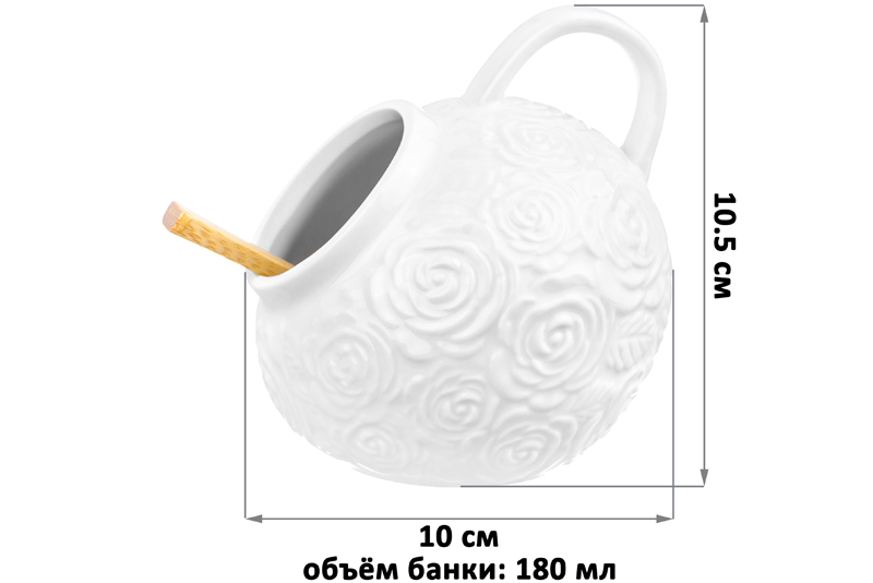 Банка из серии «Розы» от Elan Gallery послужит для организации хранения продуктов на вашей кухне. Размер ёмкости – 10х10х10,5 см, объём – 180 мл. Выполнена из высококачественного белого фарфора. Он не впитывает цвет продуктов и легко отмывается, благодаря чему надолго сохраняет свою белизну. Поверхность изделия украшают рельефные узоры в виде пышных бутонов роз. Ложка выполнена из натурального бамбука. Ёмкость подойдёт для хранения разнообразных сыпучих продуктов. Заполните её сахаром и солью, специями и приправами, чтобы во время приготовления и приёма пищи всё необходимое было под рукой. Засыпьте внутрь чай или кофе, чтобы в любой момент заварить свежий напиток. Подайте вместе с горячими блюдами, чтобы каждый мог приправить пищу по своему вкусу. Ложечка поможет удобно набрать необходимое количество продуктов. Банка имеет оригинальную форму, которая позволяет эффективнее расходовать содержимое и предотвращать скопление остатков на дне. Благодаря прочной ручке изделие легко переносить и подавать к столу. Такое изделие отлично дополнит сервировку стола как для сытного завтрака, так и для уютного чаепития. Не рекомендуется применять абразивные моющие средства. Без ложки подходит для использования в посудомоечной машине и микроволновой печи. Бамбук нельзя замачивать! Поставляется в дизайнерской картонной коробке – благодаря ей вам не потребуется дополнительная подарочная упаковка. Фарфоровая сервировочная посуда будет оригинальным подарком для хозяйки, ценящей не только практичность, но и привлекательность. Серия «Розы» от бренда Элан Галерея станет украшением любого кухонного инвентаря и позволит собрать красивый сервиз в едином стиле!