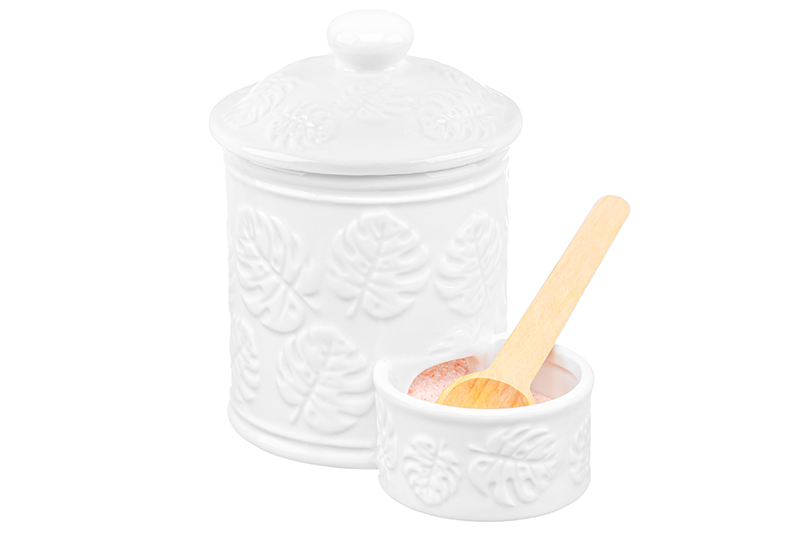 Банка для сыпучих продуктов из серии «Тропики» от Elan Gallery послужит для организации хранения на вашей кухне. Размер ёмкости – 15,5х10х14,5 см, объём – 500 мл. Выполнена из высококачественного белого фарфора и украшена рельефными узорами в виде тропических листьев. Фарфор не впитывает цвет продуктов, легко отмывается и надолго сохраняет свою белизну. Ложка выполнена из бамбука. Ёмкость подойдёт для хранения разнообразных сыпучих продуктов. Заполните её солью или сахаром, специями и приправами, чтобы во время приготовления пищи всё необходимое было под рукой. Насыпьте внутрь чай или кофе, чтобы в любой момент заварить свежий напиток. Подайте её вместе с горячими блюдами, заполнив любимыми специями, чтобы каждый мог приправить пищу по своему вкусу. Внешний кармашек обеспечит вам быстрый доступ к продуктам, а необычная форма поможет эффективнее расходовать содержимое, предотвращая скопление остатков на дне. Маленькая деревянная ложечка позволит удобно набрать необходимое количество продуктов. Такое изделие идеально дополнит сервировку стола для любого приёма пищи! Не рекомендуется применять абразивные моющие средства. Без ложки подходит для использования в посудомоечной машине и микроволновой печи. Бамбук нельзя замачивать! Поставляется в дизайнерской картонной коробке – благодаря ей вам не потребуется дополнительная подарочная упаковка. Это идеальный подарок для хозяйки, ценящей не только практичность, но и привлекательность. Серия «Тропики» от бренда Элан Галерея станет украшением любого кухонного инвентаря и позволит собрать сервиз в едином стиле!