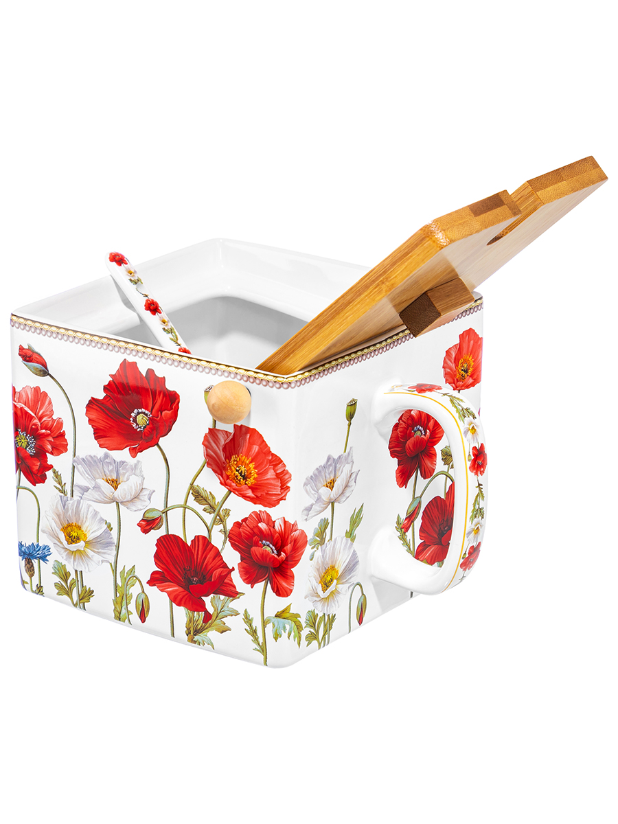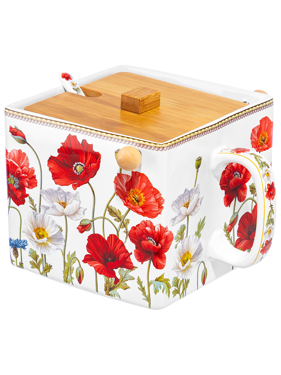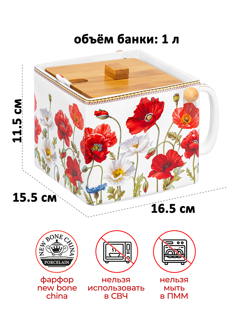 Банка д/сыпучих прод. 1 л 16,5х15,5х11,5 см "Маки", с откид. бамбук. крыш.+ложка NEW BONE CHINA