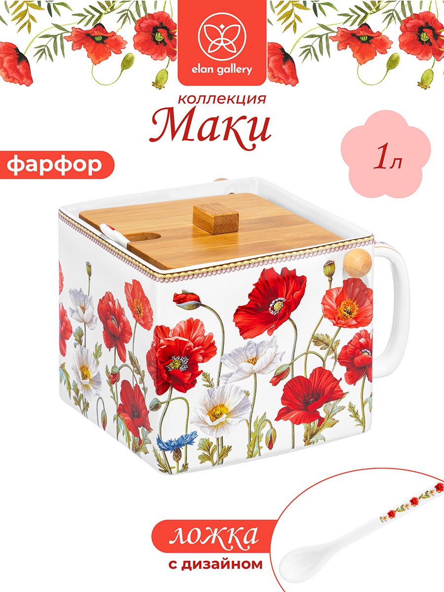 Банка для хранения сыпучих продуктов Elan Gallery "Маки" 16,5х15,5х11,5 см выполнена из фарфора нового поколения new bone china. New bone china сочетает в себе изящность и высокую прочность. От классического костяного фарфора материал отличается большей экологичностью в производстве. Объём ёмкости – 1 литр. Баночка имеет откидную крышку из натурального бамбука размером 11х11х2 см и фарфоровую ложечку в комплекте. На задней стенке предусмотрена ручка, что удобно для переноса. Серия "Маки" украшена красочным принтом с крупными цветами. Изображение красных и белых маков добавит ярких красок вашей кухне. Фарфоровая банка с ложкой позволит эстетично хранить на вашей кухне соль, сахар или приправы. Откидная бамбуковая крышка на контейнере обеспечит быстрый доступ к специям в процессе приготовления пищи. Красивый кухонный инвентарь можно хранить не только в шкафу, но и на столе и открытых полках. Удобно использовать для сухофруктов и орешков. Декоративная баночка позволит не просто хранить чай, кофе и орехи на вашей кухне, но и станет элементом её декора. Подойдёт для сервировки любых сладостей: джема, варенья и мёда. Не рекомендуется применять абразивные моющие средства. Нельзя использовать в микроволновой печи и посудомоечной машине. Бамбук нельзя замачивать! Поставляется в стильной картонной коробке. Благодаря яркой коробочке не понадобится подарочная упаковка, если захотите сделать сюрприз своим близким. Станет приятным подарком на любой праздник. Красивая банка для хранения станет украшением интерьера и может быть использована как сахарница или медовница. В коллекции бренда Элан Галерея вы найдёте посуду и товары для дома на любой вкус!