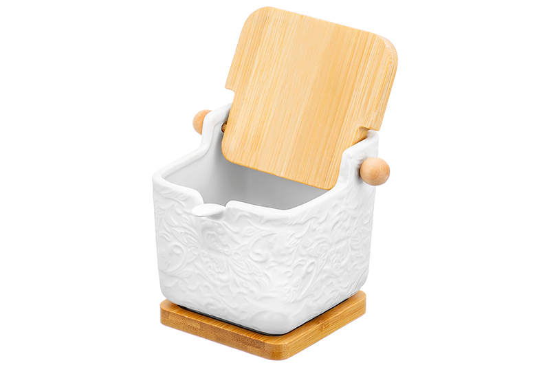 Банка для сыпучих продуктов Elan Gallery "Лоза" объёмом 300 мл и размером 12х9х9,5 см выполнена из белого фарфора и украшена рельефным узором. Баночка имеет откидную крышку и съёмную подставку из натурального бамбука. Поставляется в комплекте с фарфоровой ложечкой. Ёмкость для сыпучих продуктов с ложкой станет удобным и эстетичным дополнением вашей кухни. Банка позволит не просто хранить чай, сахар или соль на вашей кухне, но и станет элементом её декора. Баночка с откидной бамбуковой крышечкой украсит интерьер любой кухни или столовой. Можно использовать для специй или приправ. Не рекомендуется применять абразивные моющие средства. Не использовать в микроволновой печи и посудомоечной машине. Бамбуковые детали нельзя замачивать! Поставляется в стильной картонной упаковке. Банка для сыпучих продуктов станет украшением вашей кухни или приятным подарком для родных и близких!