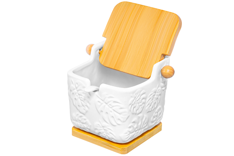 Банка для сыпучих продуктов из серии «Тропики» от Elan Gallery послужит для организации хранения на вашей кухне. Размер ёмкости – 12х9х9,5 см, объём – 300 мл. Выполнена из высококачественного белого фарфора и украшена рельефным узором в виде тропических листьев. Фарфор не впитывает цвет продуктов и легко отмывается, благодаря чему надолго сохранит свою белизну. Откидная крышка и подставка выполнены из бамбука. Изделие отлично подойдёт для хранения сыпучих продуктов: сахара и соли, чая и кофе, приправ и специй. Храните в баночке ягоды, орехи и сухофрукты. Заполните её леденцами, конфетами или печеньем. Подайте баночку к столу, чтобы идеально дополнить чайную сервировку! Герметичная деревянная крышка защитит ваши продукты от попадания грязи и пыли. Баночка впишется в любой интерьер и позволит организовать хранение даже на открытых полках. Не рекомендуется применять абразивные моющие средства. Без крышки подходит для использования в микроволновой печи и посудомоечной машине. Бамбук нельзя замачивать! Поставляется в дизайнерской картонной коробке – благодаря ей вам не потребуется дополнительная подарочная упаковка. Это идеальный подарок для хозяйки, ценящей не только практичность, но и привлекательность. Серия «Тропики» от бренда Elan Gallery станет украшением любого кухонного инвентаря и позволит собрать сервиз в едином стиле!
