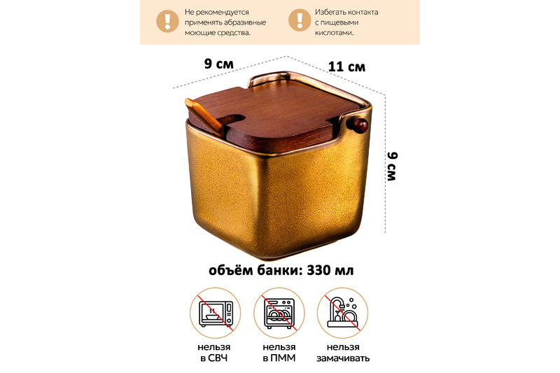 Банка для сыпучих продуктов из серии «Бронза» станет стильным дополнением вашей кухни. Размер изделия – 11х9х9 см, объём – 330 мл, высота без крышки – 9 см. Изделие выполнено из фарфора и имеет откидную бамбуковую крышку. В комплект входит ложечка из бамбука. Необычная геометрическая форма и бронзовый оттенок придают посуде лимитированной серии Bronze Fusion Porcelain Collection элегантный вид. Спокойный и гармоничный дизайн сочетает в себе прочность бронзы и изысканность фарфора. Банка надолго сохранит привлекательный внешний вид, не впитывает цвет и запах продуктов, а бронзовое покрытие придаёт посуде неповторимый блеск. Фарфоровая ёмкость подойдёт для чая, кофе, сахара, соли, приправ, специй, круп и орехов. Не рекомендуется применять абразивные моющие средства. Из-за бамбуковых деталей изделие не подходит для использования в микроволновой печи и посудомоечной машине. Поставляется в стильной картонной упаковке. Банка для сыпучих продуктов станет настоящим украшением вашего дома и чудесным подарком для любой хозяйки. Посуда лимитированной серии Bronze Fusion Porcelain Collection украсит кухонный интерьер и будет прекрасно сочетаться между собой!