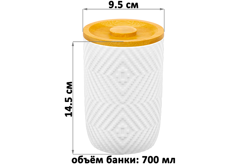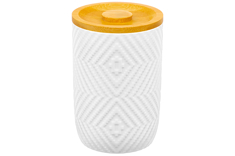 Банка от Elan Gallery предназначена для организации хранения продуктов на вашей кухне. Размер ёмкости – 9,5х9,5х14,5 см, объём – 700 мл. Выполнена из высококачественного белого фарфора. Он не впитывает цвет продуктов и легко отмывается, благодаря чему надолго сохранит свою белизну. Поверхность изделия украшена геометрическим рельефным узором. Крышка выполнена из натурального бамбука, оснащена силиконовым уплотнителем и ручкой, обеспечивающей удобное снятие. Изделие отлично подойдёт для хранения сыпучих продуктов: сахара и соли, чая и кофе, приправ и специй. Храните в баночке ягоды, орехи и сухофрукты. Заполните её леденцами, конфетами или печеньем. Подайте баночку к столу, чтобы идеально дополнить чайную сервировку! Герметичная деревянная крышка защитит ваши продукты от попадания грязи и пыли. Баночка впишется в любой интерьер и позволит организовать хранение даже на открытых полках. Не рекомендуется применять абразивные моющие средства. Подходит для использования в микроволновой печи. Без бамбуковой крышки подходит для использования в посудомоечной машине. Бамбук нельзя замачивать! Поставляется в дизайнерской картонной коробке – благодаря ей вам не потребуется дополнительная подарочная упаковка. Это идеальный подарок для хозяйки, ценящей не только практичность, но и стиль. В ассортименте бренда Элан Галерея представлены банки для хранения на любой вкус. Соберите целый набор для эстетичного хранения продуктов на вашей кухне!