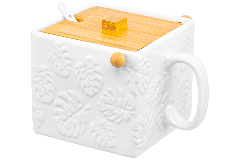 Сахарница с ложкой из серии «Тропики» предназначена для красивой сервировки вашего стола. Размер изделия – 16,5х15х12 см, объём – 1 литр. Выполнена из высококачественного белого фарфора, крышка выполнена из натурального бамбука. Фарфор не впитывает цвет продуктов и легко отмывается, благодаря чему надолго сохранит свою белизну. Поверхность изделия украшают рельефные узоры в виде тропических листьев. Декоративная баночка гармонично дополнит сервировку любого стола и добавит особого шарма вашему кухонному инвентарю. Вместительный контейнер подойдёт для хранения сахара и соли, специй, приправ и других сыпучих продуктов. Эстетичную ёмкость с крышечкой можно приспособить не только под сахар, но и под варенье, мёд или икру. Вы с лёгкостью наберёте необходимое количество продукта ложечкой, которая компактно помещается в баночку благодаря выемке на крышке. Она отлично послужит в качестве медовницы и станет альтернативой традиционным медовым горшочкам и бочонкам! Не рекомендуется применять абразивные моющие средства. Без бамбуковой крышки подходит для использования в посудомоечной машине и микроволновой печи. Бамбук нельзя замачивать! Поставляется в дизайнерской коробке – благодаря ей вам не потребуется дополнительная подарочная упаковка. Фарфоровая сервировочная посуда послужит оригинальным подарком для хозяйки, ценящей не только практичность, но и привлекательность. Серия «Тропики» станет украшением любого кухонного инвентаря и позволит собрать сервиз в едином стиле!