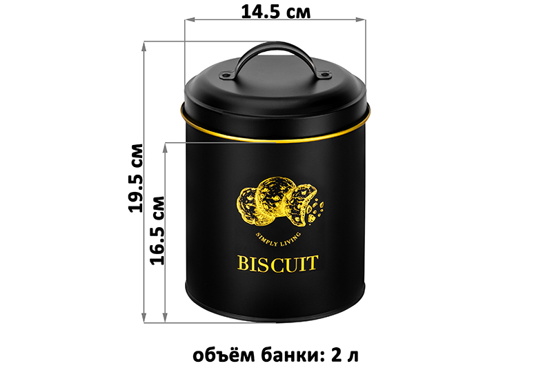 Банка для печенья чёрного цвета от Elan Gallery – это стильное решение для хранения лакомств! Размер 14,5х14,5х19,5 см, объём 2 литра. Высота без крышки 16,5 см. Выполнена из металла с пудровым покрытием, что обеспечивает долговечность использования. Пудровое покрытие и минималистичный рисунок золотого цвета придают стиля. Контейнер украшен золотистым изображением овсяного печенья и надписями: "Simply living" ("Жить просто") и "Biscuit" ("Печенье"). Фраза "Simply living" – это отсылка к интерьерным решениям для кухни, направленным на упрощение вашей жизни. Благодаря кухонному органайзеру любимые сладости будут под рукой! Металлическая крышечка с ручкой в форме петельки защищает продукты от пыли и влаги. Сервировочная ёмкость дополнит вашу коллекцию кухонного инвентаря. Благодаря стильному дизайну баночка станет предметом декора кухни или столовой, украсит интерьер. Храните в ней вафли и пряники. Органайзер подойдёт для пакетов с выпечкой и большого количества конфет. В большую баночку уместится много конфеток и шоколадок, в отличие от декоративной конфетницы или вазочки. Можно использовать для сервировки. Красивая подача угощений к чаю позволит создать особую атмосферу. Альтернативный вариант использования железной коробочки – для хранения украшений или швейных принадлежностей. Не рекомендуется применять абразивные моющие средства. Нельзя использовать в посудомоечной машине. Банка для печенья от Elan Gallery позволит эстетично хранить любимые лакомства и удивит ваших гостей. Станет полезным подарком на любой праздник мужчинам и женщинам. Поставляется в стильной картонной коробке. Благодаря красочной коробочке не понадобится подарочная упаковка. В коллекции бренда Элан Галерея представлено много товаров для дома. Здесь вы найдёте банки для хранения круп и других сыпучих продуктов, а также хлебницы. Соберите набор посуды для вашей кухни в едином стиле!