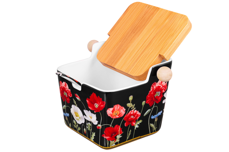 Банка для сыпучих продуктов 300 мл 12*9,5*9 см "Маки на черном" с отк. бамбук.крышкой NEW BONE CHINA