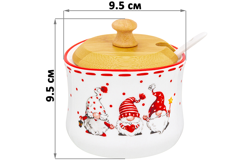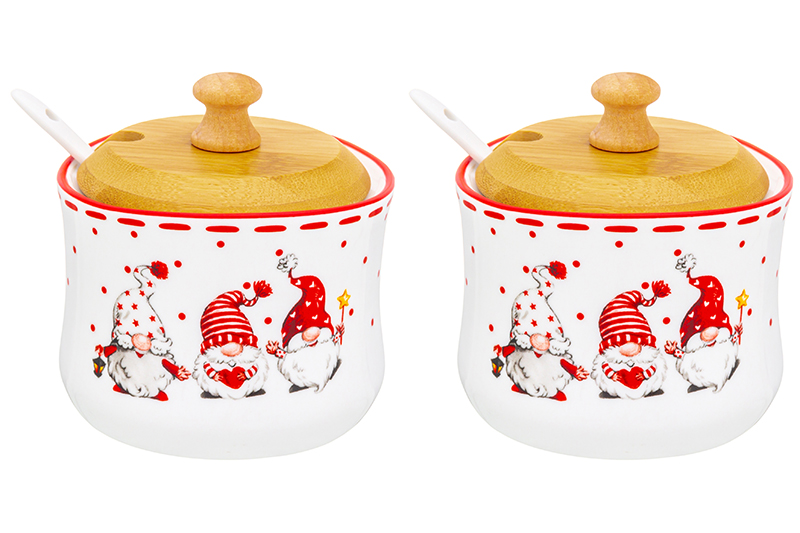 Набор серии "Веселые гномики" состоит из 2-х баночек для специй объемом по 250 мл с бамбуковыми крышками и фарфоровыми ложками. Такие баночки подойдут для хранения и сервировки чая, кофе, сахара, специй, варенья, меда и многих других продуктов. Набор выполнен из высококачественного фарфора и украшен яркими изображениями гномиков. Гномы, маленькие новогодние помощники, принесут праздничную атмосферу и подарят каждому хорошее настроение. Размер каждой банки 9,5х9х9,5 см. Банки без крышек можно использовать в микроволновой печи и посудомоечной машине. Бамбуковые крышки нельзя замачивать. Набор поставляется в стильной картонной упаковке. Баночки из серии посуды "Веселые гномики" смогут стать настоящим украшением кухни или приятным подарком для ваших родных и близких!