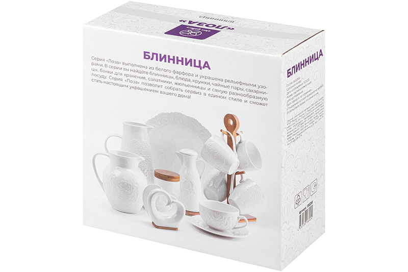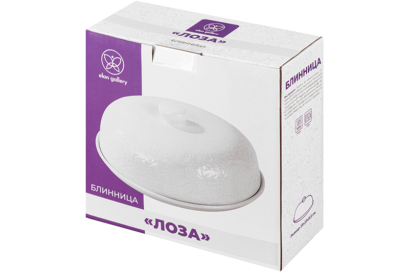 Блинница с крышкой Elan Gallery "Лоза" размером 23х23х9,5 см выполнена из белого фарфора и украшена изящным рельефным узором. Высота без крышки 1,5 см. Можно использовать не только для хранения блинчиков и оладий, но и подачи печенья, кусочков торта и пирога. Под крышкой блины долго не остынут и сохранят свой первозданный вид и вкус. Блинница эстетично смотрится на столе и подойдёт для сервировки нарезки, бутербродов и выпечки. Блюдо с крышкой можно использовать для подачи сыра, шашлыка, пиццы, а также фруктов, десерта и разноса любых закусок на празднике. Фарфоровая посуда отличается от керамической повышенной плотностью. Фарфор не впитывает цвет продуктов и не деформируется от влаги, чему может быть подвержена керамика. Не рекомендуется применять абразивные моющие средства. Тарелку с крышкой можно использовать в посудомоечной машине и микроволновой печи. Поставляется в стильной картонной упаковке. Красивый кухонный инвентарь – отличный подарок для любой хозяйки! Сервировочное блюдо станет украшением вашего стола как на праздник, так и в будни и поможет сохранить тепло и аромат продуктов.