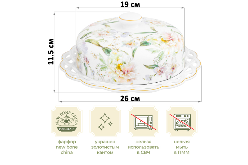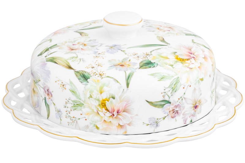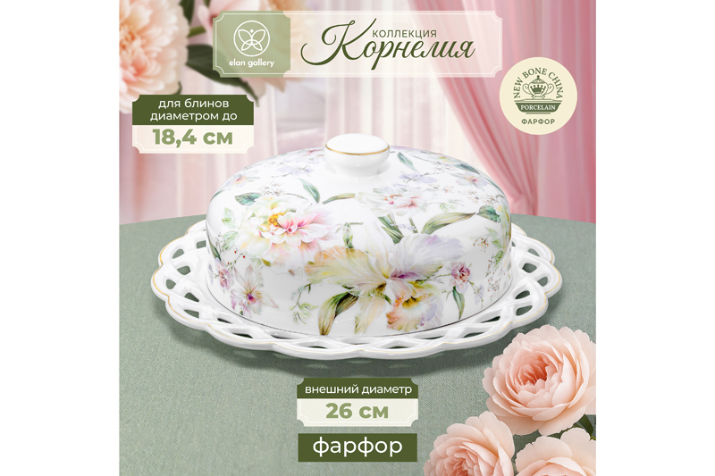 Блинница с крышкой Elan Gallery "Корнелия" размером 26х26х11,5 см выполнена из фарфора new bone china. Внутренний диаметр тарелки под крышкой 18,4 см. Внутренний диаметр крышки 19 см. New bone china сочетает в себе изящность и высокую прочность. От других видов костяного фарфора материал отличается большей экологичностью в производстве. Поверхность изделия овивают обворожительные белые пионы. Они выполнены в манере, вдохновлённой акварельным рисунком. Тонкая золотистая окантовка служит деликатным акцентом и подчёркивает их изысканность. Можно использовать не только для хранения блинчиков и оладий, но и подачи печенья, кусочков торта и пирога. Под крышкой блины долго не остынут и сохранят свой первозданный вид и вкус. Блинница эстетично смотрится на столе и подойдёт для сервировки нарезки, бутербродов и выпечки. Блюдо с крышкой можно использовать для подачи сыра, шашлыка, пиццы, а также фруктов, десерта и разноса любых закусок на празднике. Фарфоровая посуда отличается от керамической повышенной плотностью. Фарфор не впитывает цвет продуктов и не деформируется от влаги, чему может быть подвержена керамика. Не рекомендуется применять абразивные моющие средства. Тарелку и крышку нельзя использовать в посудомоечной машине и микроволновой печи. Поставляется в стильной картонной коробке. Красивый кухонный инвентарь – отличный подарок на любой праздник! Благодаря красочной коробочке не понадобится подарочная упаковка, если вы решите сделать сюрприз своим близким. Сервировочное блюдо станет украшением вашего стола как на праздник, так и в будни и поможет сохранить тепло и аромат продуктов. Серия "Корнелия" от бренда Элан Галерея добавит вашему кухонному инвентарю лёгкости и элегантности, преобразив любую сервировку!