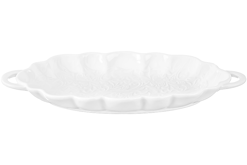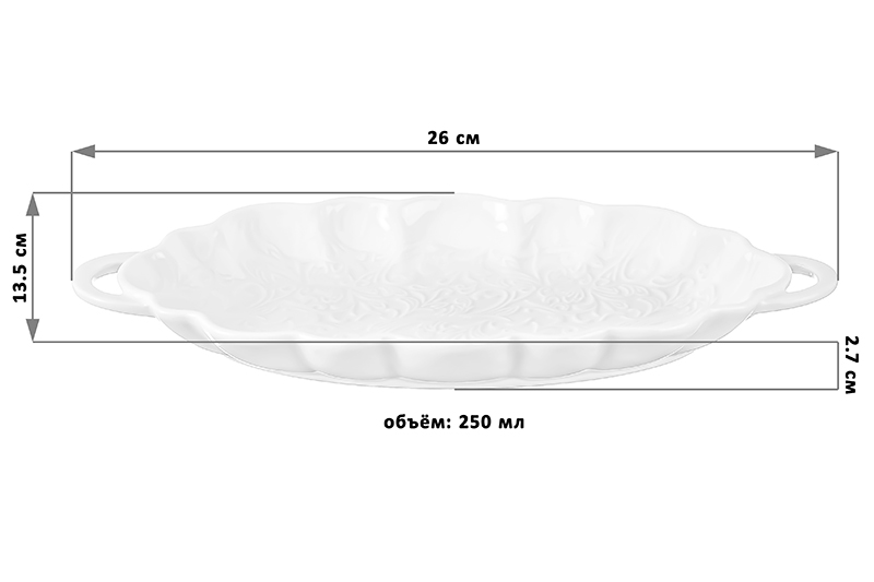 Блюдо для нарезки Elan Gallery "Лоза" размером 26х13,5х2,7 см и объёмом 250 мл станет украшением вашего стола как в будни, так и на праздник. Сервировочная тарелочка с ручками выполнена из белого фарфора и украшена рельефными узорами. Тарелка подходит для сервировки и подачи сырной и мясной нарезки, канапе и других закусок. Сервировочное блюдо пригодится, чтобы создать идеальную атмосферу для приема гостей или романтического ужина дома. Вы можете использовать эту тарелочку для сыра или колбасы. Положите в неё красную рыбу и украсьте свежей зеленью, чтобы порадовать гостей за праздничным столом. Декоративные ручки позволят переносить блюдце из кухни на праздничный стол. Подойдёт для конфет или нарезанных фруктов. Не рекомендуется применять абразивные моющие средства. Можно использовать в микроволновой печи и мыть в посудомоечной машине. Поставляется в стильной картонной упаковке. Эта тарелка станет приятным подарком для любой хозяйки, которая ценит изящную сервировку. Понравится любителям посуды в классическом или скандинавском стиле. Серия "Лоза" позволит собрать сервиз в едином стиле и станет украшением вашей кухни.