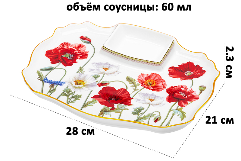 Блюдо Elan Gallery "Маки" размером 28х21х2,3 см с соусницей выполнено из фарфора нового поколения new bone china. Благодаря современным технологиям он не уступает другим видам фарфора в прочности, но при этом экологичнее в производстве. Объём соусницы – 60 мл, является неотделимой частью блюда. Серия "Маки" украшена красочным принтом с крупными цветами. Изображение красных и белых маков добавит ярких красок вашей кухне. Тарелка с соусником подойдёт для сервировки закусок, нарезки, блюд из мяса или рыбы. Очень удобна для подачи суши и ролл, так как вам не придётся искать отдельную ёмкость для соевого соуса. Сервировочное блюдо пригодится, чтобы создать идеальную атмосферу для приема гостей или романтического ужина дома. Возьмите это блюдо на дачу или пикник, чтобы использовать для шашлыка. Секция для соусов отлично подойдёт для кетчупа или майонеза. Не рекомендуется применять абразивные моющие средства. Можно использовать в микроволновой печи и мыть в посудомоечной машине. Поставляется в стильной картонной коробке. Эта тарелочка с отделением для соуса станет отличным подарком для любой хозяйки, которая ценит стильную сервировку. Благодаря красочной коробочке не понадобится дополнительная подарочная упаковка. В коллекции бренда Elan Gallery представлено много красивой посуды, кухонного инвентаря, предметов декора и других товаров для дома. Здесь вы найдёте всё для эстетичной сервировки, украшения интерьера и создания уюта!