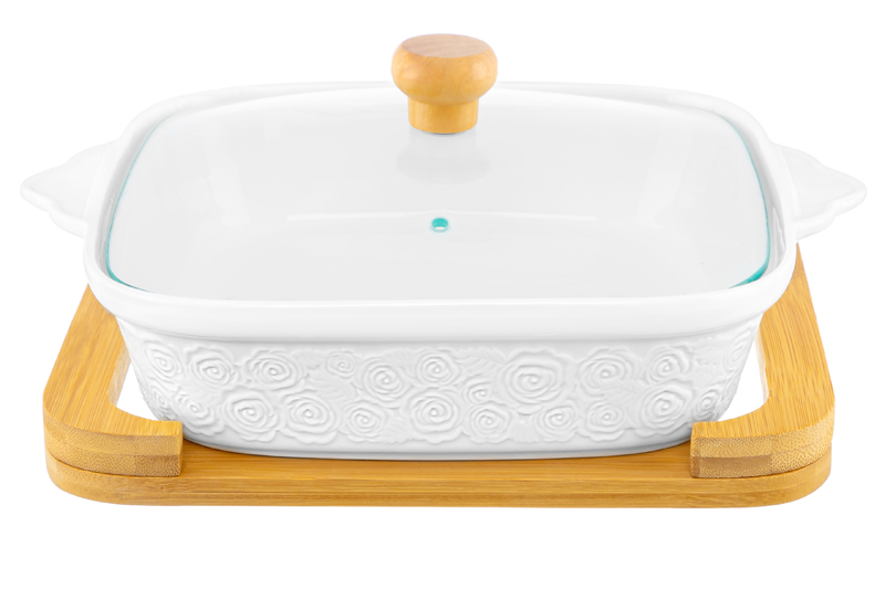 Блюдо д/зап и серв 29*24*13 см 1,3 л "Розы" квадрат + стекл крышка на дер подставке