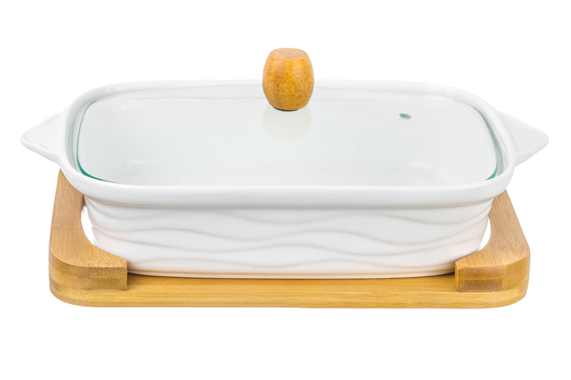 Блюдо д/зап и серв 30*18*13 см 1,1 л "Айсберг волны" прямоуг. + стекл. крышка на дер. подставке