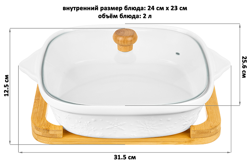 Блюдо д/зап и серв 31,5*25,6*12,5 см 2 л "Снежинки" + стекл крышка на дер подстаке