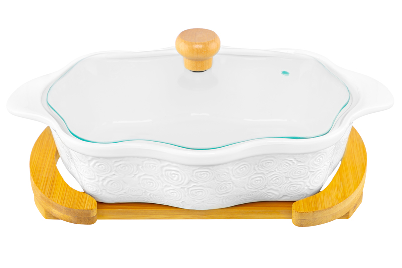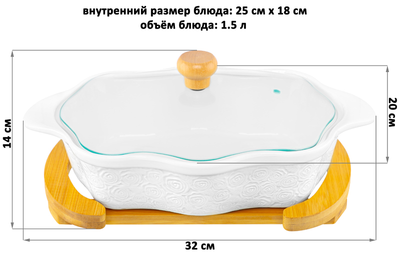 Блюдо из серии «Розы» от Elan Gallery предназначено для приготовления и эстетичной подачи ваших любимых блюд. Размер изделия – 32х20х14 см, объём – 1,5 литра. Внутренний размер блюда – 25х18 см. Выполнено из высококачественного белого фарфора. Он не впитывает цвет продуктов и легко отмывается, благодаря чему надолго сохраняет свою белизну. Поверхность изделия украшают рельефные узоры в виде пышных бутонов роз. Крышка выполнена из стекла, ручка на крышке и подставка выполнены из натурального бамбука. Изделие подойдёт для подачи сельди под шубой, салатов и плова. Используйте глубокую ёмкость в роли шубницы, чтобы порадовать гостей любимым праздничным блюдом. Послужит в качестве салатника или для подачи закусок из мяса и рыбы. Такая посуда поможет вам в приготовлении заливного и желе. Крышка поможет сохранить температуру блюд, а удобная деревянная ручка облегчит её снятие и не даст обжечься. Подставка защитит поверхности от воздействия высоких температур и послужит в качестве подноса для безопасной и комфортной подачи блюда к столу. Без крышки и подставки блюдо подойдёт для запекания бисквита и творожных запеканок. Изделие подойдёт для сервировки большого брикета мороженого, которое можно разделить с семьёй или друзьями. Не рекомендуется применять абразивные моющие средства. Без крышки и подставки подходит для использования в посудомоечной машине, микроволновой печи и духовом шкафу при температуре до 230 градусов. Бамбук нельзя замачивать! Поставляется в дизайнерской картонной коробке – благодаря ей вам не потребуется дополнительная подарочная упаковка. Фарфоровая сервировочная посуда будет оригинальным подарком для хозяйки, ценящей не только практичность, но и привлекательность. Серия «Розы» от бренда Элан Галерея станет украшением любого кухонного инвентаря и позволит собрать красивый сервиз в едином стиле!