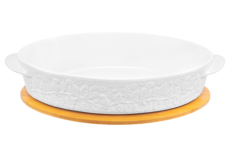 Блюдо «Птички на ветке» от Elan Gallery предназначено для запекания и сервировки горячих блюд. Размер ёмкости – 35х24х8 см, объём – 2,5 литра. Внутренний размер блюда – 30х22,5х6,5 см. Выполнено из высококачественного белого фарфора. Он не впитывает цвет продуктов и легко отмывается, благодаря чему надолго сохранит свою белизну. Поверхность изделия украшена рельефным узором в виде лиственных веточек и сидящих на них птичек. Крышка выполнена из натурального бамбука. Глубокая тарелка подходит для выпечки блюд в духовом шкафу и их подачи – вам не потребуется дополнительная сервировочная посуда. Она также послужит в качестве большой салатницы и незаменимым помощником на застольях. Заполните её любимыми закусками – сырной и мясной нарезкой, свежими овощами и фруктами. Эстетично подайте выпечку и сладости – конфеты, пирожные, пирожки, кусочки торта или домашнего пирога. Деревянная крышка может выполнять функцию подставки благодаря углублению, соответствующему размеру дна блюда. Это поможет защитить поверхности от воздействия высоких температур. Не рекомендуется применять абразивные моющие средства. Без бамбуковой крышки подходит для использования в микроволновой печи, посудомоечной машине и духовом шкафу при температуре до 230 градусов. Бамбук нельзя замачивать! Поставляется в дизайнерской картонной коробке – благодаря ей вам не потребуется дополнительная подарочная упаковка. Фарфоровая сервировочная посуда послужит оригинальным подарком для хозяйки, ценящей не только практичность, но и привлекательность. Серия «Птички на ветке» от бренда Элан Галерея станет украшением любого кухонного инвентаря и позволит собрать сервиз в едином стиле!