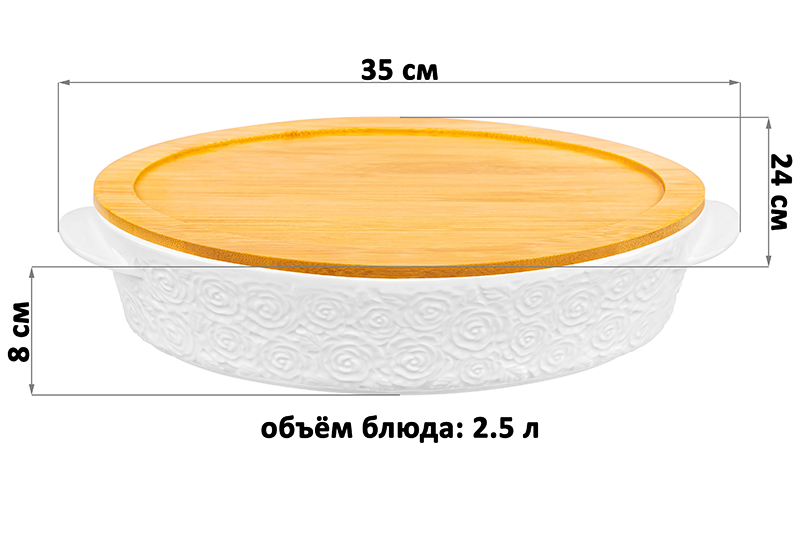 Блюдо «Розы» от Elan Gallery предназначено для запекания и сервировки горячих блюд. Размер ёмкости – 35х24х8 см, объём – 2,5 литра. Внутренний размер блюда – 30х22,5х6,5 см. Выполнено из высококачественного белого фарфора. Он не впитывает цвет продуктов и легко отмывается, благодаря чему надолго сохранит свою белизну. Поверхность изделия украшена рельефным узором в виде лиственных веточек и сидящих на них птичек. Крышка выполнена из натурального бамбука. Глубокая тарелка подходит для выпечки блюд в духовом шкафу и их подачи – вам не потребуется дополнительная сервировочная посуда. Она также послужит в качестве большой салатницы и незаменимым помощником на застольях. Заполните её любимыми закусками – сырной и мясной нарезкой, свежими овощами и фруктами. Эстетично подайте выпечку и сладости – конфеты, пирожные, пирожки, кусочки торта или домашнего пирога. Деревянная крышка может выполнять функцию подставки благодаря углублению, соответствующему размеру дна блюда. Это поможет защитить поверхности от воздействия высоких температур. Не рекомендуется применять абразивные моющие средства. Без бамбуковой крышки подходит для использования в микроволновой печи, посудомоечной машине и духовом шкафу при температуре до 230 градусов. Бамбук нельзя замачивать! Поставляется в дизайнерской картонной коробке – благодаря ей вам не потребуется дополнительная подарочная упаковка. Фарфоровая сервировочная посуда послужит оригинальным подарком для хозяйки, ценящей не только практичность, но и привлекательность. Серия «Розы» от бренда Элан Галерея станет украшением любого кухонного инвентаря и позволит собрать сервиз в едином стиле!