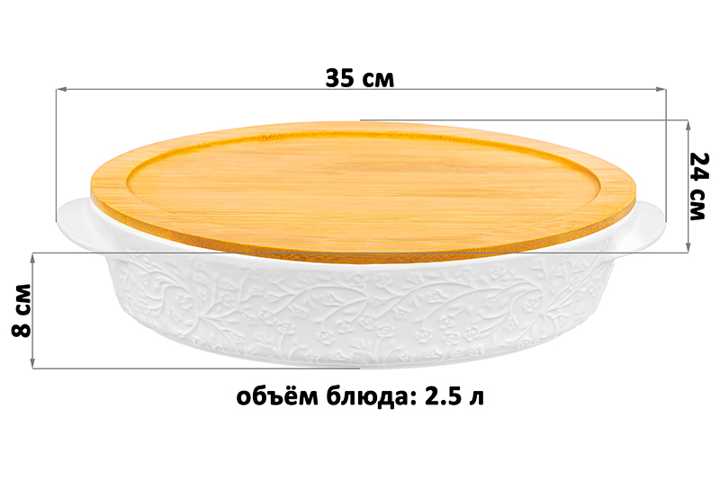 Блюдо «Веточки-цветочки» от Elan Gallery предназначено для запекания и сервировки горячих блюд. Размер ёмкости – 35х24х8 см, объём – 2,5 литра. Внутренний размер блюда – 30х22,5х6,5 см. Выполнено из высококачественного белого фарфора. Он не впитывает цвет продуктов и легко отмывается, благодаря чему надолго сохранит свою белизну. Поверхность изделия украшена рельефным узором в виде лиственных и цветочных веточек. Крышка выполнена из натурального бамбука. Глубокая тарелка подходит для выпечки блюд в духовом шкафу и их подачи – вам не потребуется дополнительная сервировочная посуда. Она также послужит в качестве большой салатницы и незаменимым помощником на застольях. Заполните её любимыми закусками – сырной и мясной нарезкой, свежими овощами и фруктами. Эстетично подайте выпечку и сладости – конфеты, пирожные, пирожки, кусочки торта или домашнего пирога. Деревянная крышка может выполнять функцию подставки благодаря углублению, соответствующему размеру дна блюда. Это поможет защитить поверхности от воздействия высоких температур. Не рекомендуется применять абразивные моющие средства. Без бамбуковой крышки подходит для использования в микроволновой печи, посудомоечной машине и духовом шкафу при температуре до 230 градусов. Бамбук нельзя замачивать! Поставляется в дизайнерской картонной коробке – благодаря ей вам не потребуется дополнительная подарочная упаковка. Фарфоровая сервировочная посуда послужит оригинальным подарком для хозяйки, ценящей не только практичность, но и привлекательность. Серия «Веточки-цветочки» от бренда Элан Галерея станет украшением любого кухонного инвентаря и позволит собрать сервиз в едином стиле!