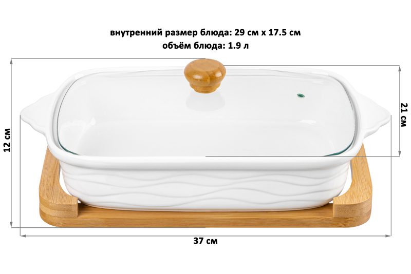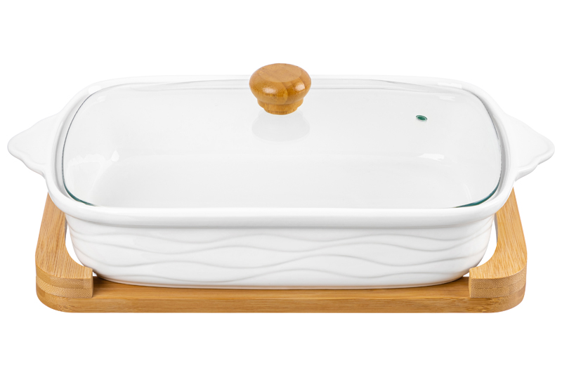 Блюдо д/зап и серв 37*21*12 см 1,9 л "Айсберг волны" прямоуг. + стекл. крышка на дер. подставке