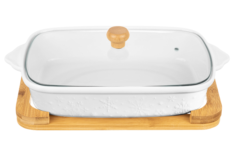 Блюдо д/зап и серв 37*21*12 см 1,9 л "Снежинки" прямоуг + стекл крышка на дер подст.