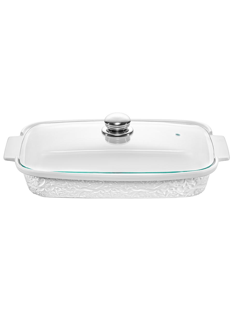 Блюдо для запекания и сервировки с крышкой Elan Gallery "Лоза" размером 34х21,5х10,5 см и объёмом 1,8 литра выполнено из белого фарфора. Размер без крышки 34х21,5х6 см. Форма украшена изящным рельефным узором. Крышка изготовлена из прозрачного стекла, имеет ручку серебряного цвета из металла. Глубокую ёмкость можно использовать для выпекания в духовке. Внутренний размер прямоугольного контейнера 25х16х5 см. Фарфор легко отмывается и не впитывает цвет продуктов. Блюдо послужит в качестве декоративной тарелки для подачи горячих угощений, закусок и десертов. Подайте к столу блюда из рыбы, мяса или овощное рагу. Стеклянная крышка надолго сохранит тепло готовых угощений. Посуду можно использовать для хранения готовых блюд. Ручки обеспечат удобство при переносе. Не рекомендуется применять абразивные моющие средства. Без крышки фарфоровую ёмкость можно использовать в микроволновой печи и посудомоечной машине. В духовом шкафу при температуре до 230 градусов можно использовать с крышкой (стекло жаропрочное). Поставляется в красивой картонной упаковке. Станет приятным подарком на любой праздник и дополнением вашего кухонного инвентаря. Коллекция "Лоза" позволит собрать фарфоровый сервиз в едином стиле и станет украшением вашей кухни. В ассортименте бренда Элан Галерея представлено много красивой посуды, принадлежностей для выпечки и стильных товаров для дома. Выберите варианты на свой вкус!