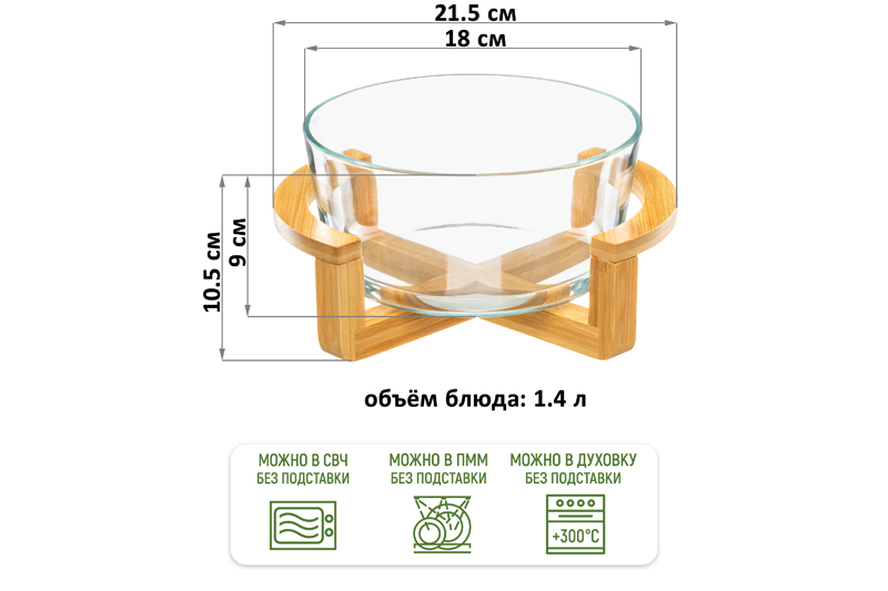 Блюдо на деревянной подставке предназначено для приготовления и подачи горячих и холодных блюд. Размер изделия на подставке – 21,5х18х10,5 см. Размер блюда – 18х18х9 см , объём – 1,4 литра. Выполнено из жаростойкого стекла, подставка – из натурального бамбука. Ёмкость предназначена для запекания блюд из рыбы, мяса или овощей. С её помощью вы можете приготовить творожную запеканку, пирог, домашнюю пиццу, бисквит, кекс и любое другое угощение. Прямоугольное блюдо подходит не только для запекания, но и для сервировки. Помимо запекания, форма прекрасно подходит для сервировки: подавайте в ней закуски, нарезки, свежие овощи и фрукты, радуя семью и гостей. Используйте её в качестве салатницы или шубницы, а также для приготовления холодца, желе или суфле. Бамбуковая подставка придаст сервировке эстетичный вид и позволит удобно разместить блюдо на столе, защитив его от воздействия высоких температур. Не рекомендуется применять абразивные моющие средства. Без бамбуковой подставки подходит для использования в посудомоечной машине, микроволновой печи, а также духовом шкафу. Допустимый температурный режим использования без подставки – от -40°C до 300°C. Бамбук нельзя замачивать, использовать в посудомоечной машине, микроволновой печи и духовом шкафу! Вынимайте из духовки только сухими прихватками. Не ставьте на бамбуковую подставку мокрое изделие, не допускайте резких перепадов температур. Не ставьте горячее блюдо на холодные или мокрые поверхность. Не используйте металлические или острые приборы. Поставляется в стильной картонной коробке – благодаря ей вам не потребуется дополнительная подарочная упаковка. Блюдо станет отличным подарком для хозяйки, ценящей функциональный и стильный кухонный инвентарь!