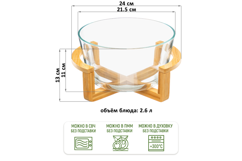 Блюдо на деревянной подставке предназначено для приготовления и подачи горячих и холодных блюд. Размер изделия на подставке – 24х21,5х13 см. Размер блюда – 21,5х21,5х11 см , объём – 2,6 литра. Выполнено из жаростойкого стекла, подставка – из натурального бамбука. Ёмкость предназначена для запекания блюд из рыбы, мяса или овощей. С её помощью вы можете приготовить творожную запеканку, пирог, домашнюю пиццу, бисквит, кекс и любое другое угощение. Прямоугольное блюдо подходит не только для запекания, но и для сервировки. Помимо запекания, форма прекрасно подходит для сервировки: подавайте в ней закуски, нарезки, свежие овощи и фрукты, радуя семью и гостей. Используйте её в качестве салатницы или шубницы, а также для приготовления холодца, желе или суфле. Бамбуковая подставка придаст сервировке эстетичный вид и позволит удобно разместить блюдо на столе, защитив его от воздействия высоких температур. Не рекомендуется применять абразивные моющие средства. Без бамбуковой подставки подходит для использования в посудомоечной машине, микроволновой печи, а также духовом шкафу. Допустимый температурный режим использования без подставки – от -40°C до 300°C. Бамбук нельзя замачивать, использовать в посудомоечной машине, микроволновой печи и духовом шкафу! Вынимайте из духовки только сухими прихватками. Не ставьте на бамбуковую подставку мокрое изделие, не допускайте резких перепадов температур. Не ставьте горячее блюдо на холодные или мокрые поверхность. Не используйте металлические или острые приборы. Поставляется в стильной картонной коробке – благодаря ей вам не потребуется дополнительная подарочная упаковка. Блюдо станет отличным подарком для хозяйки, ценящей функциональный и стильный кухонный инвентарь!