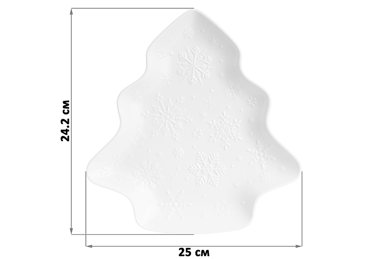 Блюдо-елочка серии "Снежинки" 25х24,2х2,8 см подойдет для подачи главных блюд, закусок, десертов и самых разных продуктов. Блюдо выполнено из высококачественного фарфора и украшено рельефными снежинками. Оно привнесет атмосферу зимнего волшебства с хлопьями снега, морозными узорами и танцующими кружевными льдинками. Блюдо можно использовать в микроволновой печи и посудомоечной машине. Поставляется в стильной картонной упаковке. Блюдо-елочка из серии посуды "Снежинки" сможет стать настоящим украшением кухни или приятным подарком для ваших родных и близких!