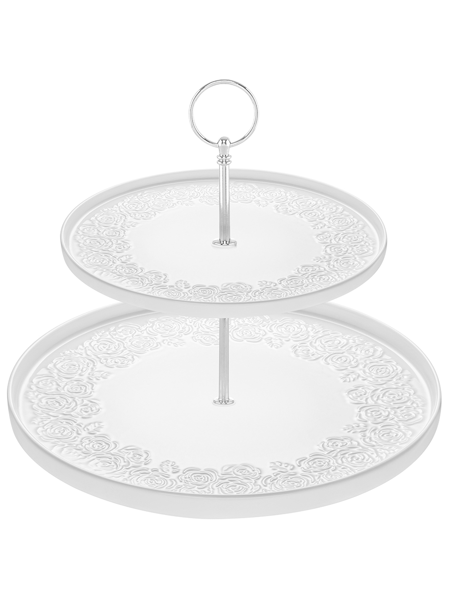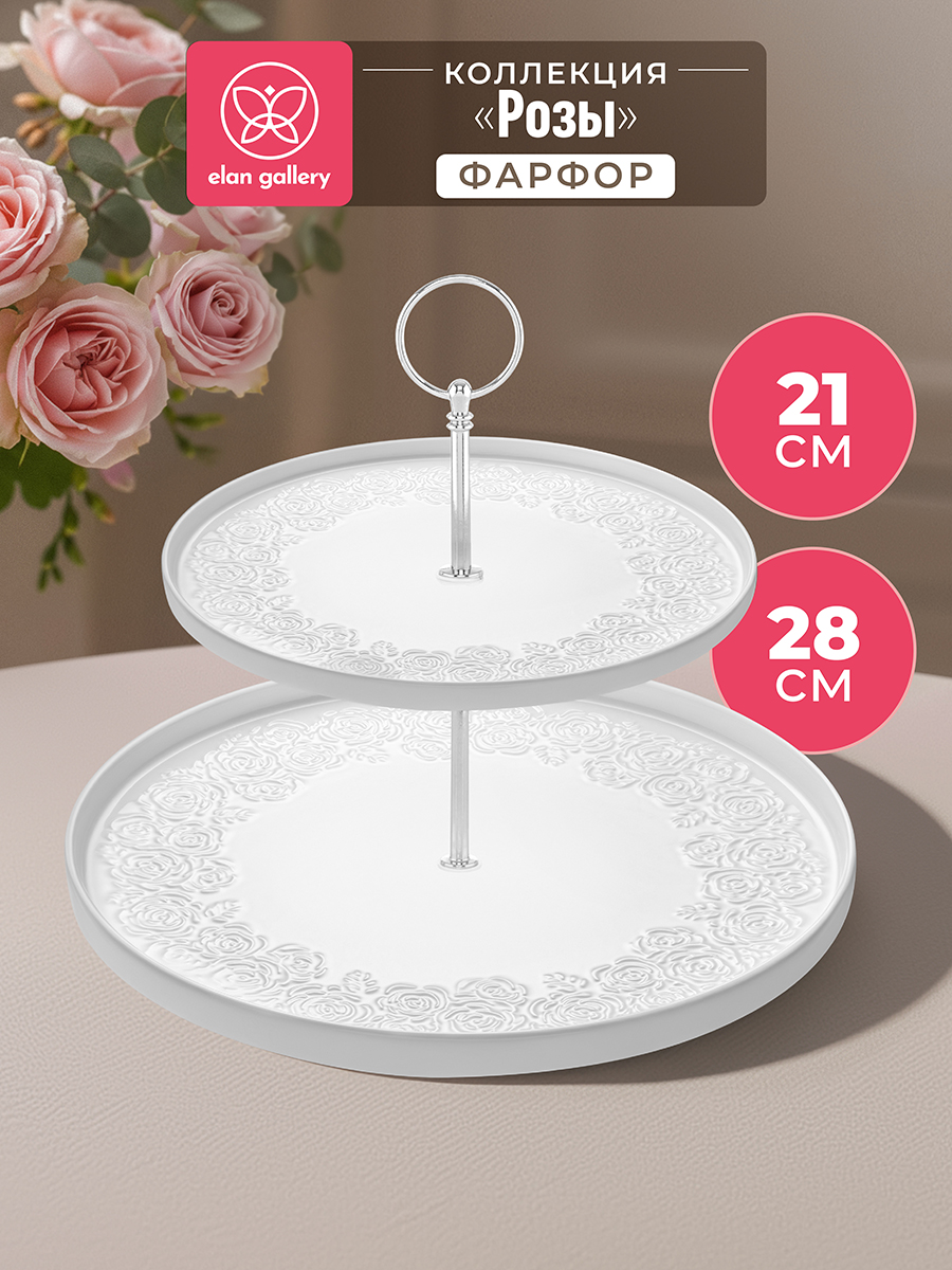 Блюдо-этажерка из серии «Розы» от Elan Gallery предназначено для эстетичной сервировки вашего стола. Размер изделия – 28х28х24 см. Состоит из 2 блюд: 21х21х1,8 см и 28х28х2 см. Выполнены из высококачественного белого фарфора. Он не впитывает цвет продуктов и легко отмывается, благодаря чему надолго сохраняет свою белизну. Кайма блюд украшена рельефным узором в виде пышных бутонов роз. Закреплены на серебряной металлической оси. Расстояние между ярусами – 10 см. Два яруса обеспечивают достаточно места для подачи различных закусок, фруктов и ягод. Разместите на сервировочных блюдах ваши любимые сладости: пирожные, печенья и кексы. Можно использовать в роли декоративной многоуровневой конфетницы для разнообразных лакомств. Положите на тарелочки сыр, колбасу или бутерброды, чтобы угостить гостей за праздничным столом. Не рекомендуется применять абразивные моющие средства. Без металлического крепления тарелки подходят для использования в посудомоечной машине и микроволновой печи. Поставляется в дизайнерской картонной коробке – благодаря ей вам не потребуется дополнительная подарочная упаковка. Фарфоровая сервировочная посуда будет оригинальным подарком для хозяйки, ценящей не только практичность, но и привлекательность. Серия «Розы» от бренда Элан Галерея станет украшением любого кухонного инвентаря и позволит собрать красивый сервиз в едином стиле!