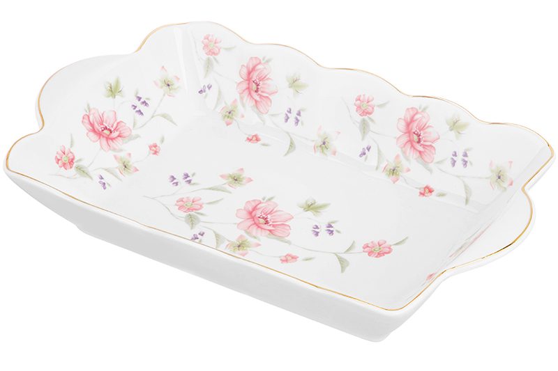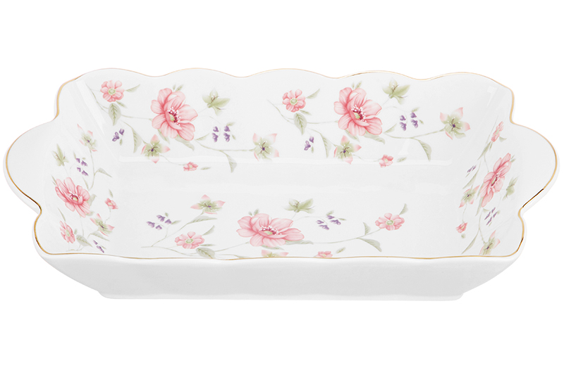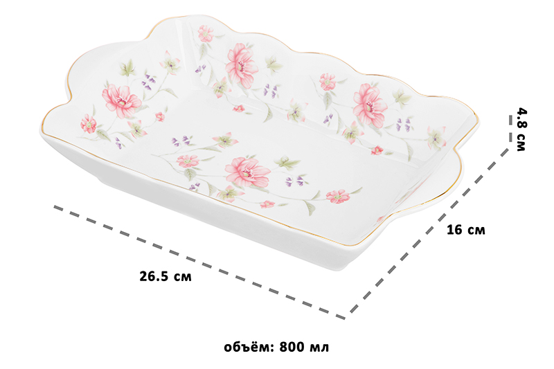 Глубокое блюдо из серии «Диана» от Elan Gallery предназначено для эстетичной сервировки вашего стола. Размер изделия – 26,5х16х4,8 см, объём – 800 мл. Выполнено из фарфора нового поколения new bone china, сочетающего в себе изящность и высокую прочность. Такие изделия легко отмываются, поэтому сохраняют привлекательный вид и практичны в использовании. От других видов костяного фарфора new bone china отличается большей экологичностью в производстве. Поверхность изделия украшает воздушный цветочный рисунок и элегантное золотое окаймление. Вместительная ёмкость с волнистыми краями подойдёт для селёдки под шубой, холодца и плова. Порадуйте себя большой порцией шашлыка или лапши, разложите суши и роллы, чтобы за большим столом каждому досталось любимое угощение. Заполните ёмкость разнообразной выпечкой и сладостями: вафлями, мармеладом, пряниками, шоколадом или печеньем. Создайте композицию из конфет, ягод, кексов и сухофруктов, чтобы удивить гостей своей кулинарной фантазией! Благодаря двум ручкам даже наполненное изделие будет удобно переносить. Благодаря нежному дизайну оно впишется в интерьер любой кухни, гостиной или столовой. Не рекомендуется применять абразивные моющие средства. Не использовать в посудомоечной машине, микроволновой печи и духовом шкафу. Поставляется в дизайнерской картонной коробке – благодаря ей вам не потребуется дополнительная подарочная упаковка. Фарфоровая сервировочная посуда будет оригинальным подарком для хозяйки, ценящей не только практичность, но и привлекательность. Серия «Диана» от бренда Элан Галерея подарит вам ощущение мечтательной лёгкости!