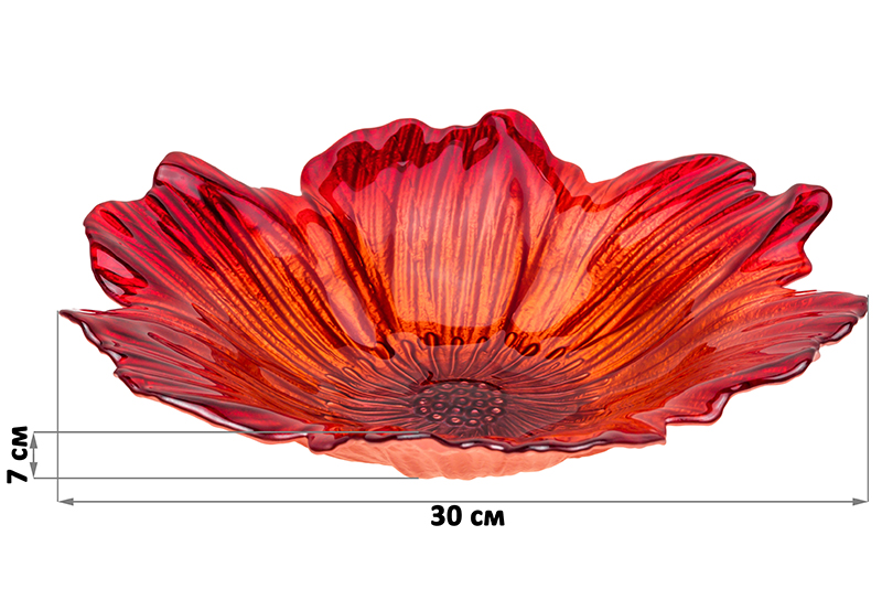 Блюдо ручной работы 30х30х7 см серии «Алые маки» выполнено из высококачественного стекла в форме цветка. Блюдо с высокими стенками подойдет для сервировки стола или украшения интерьера. Выполнено турецкими мастерами с сочетанием традиционных техник и современных технологий. Это позволило добиться высочайшего качества и роскошного внешнего вида, актуального во все времена. Блюдо можно мыть только вручную без использования абразивных средств. Не использовать в посудомоечной машине или микроволновой печи. Такое блюдо сможет стать главным украшением интерьера или приятным подарком для ваших родных и близких!