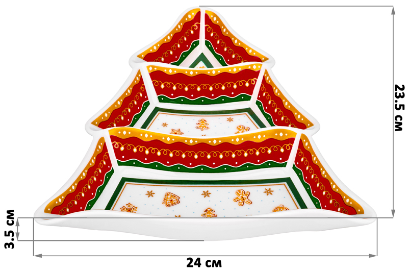 Блюдо-менажница 24*23,5*3,5 см "Новогодняя елка" красный узор, цельная 3 секции NEW BONE CHINA