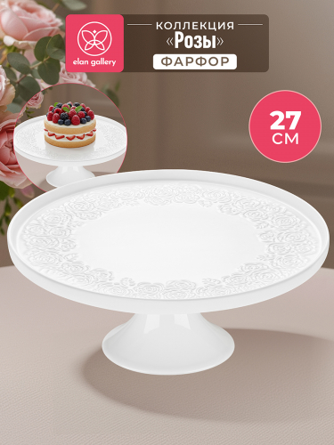 Блюдо на ножке из серии «Розы» для Elan Gallery предназначено для эстетичной сервировки вашего стола. Размер изделия – 27,5х27,5х11,5 см, внутренний диаметр блюда – 26 см. Высота ножки – 9,5 см, диаметр ножки – 11,5 см. Выполнено из высококачественного белого фарфора. Он не впитывает цвет продуктов и легко отмывается, благодаря чему надолго сохранит свою белизну. Блюдо украшено каймой в виде пышных бутонов роз. Используйте подставку для подачи к столу ваших любимых десертов. Красиво положите на неё бутерброды из хлеба и сырной или мясной нарезки, чтобы подкрепиться на завтрак. Разложите роллы, салаты, свежие овощи и фрукты. Подайте конфеты и другие сладости. Она идеально подойдёт для торта или пирога. Круглая тортовница станет уникальным дополнением вашего кухонного инвентаря. Не рекомендуется применять абразивные моющие средства. Подходит для использования в посудомоечной машине и микроволновой печи. Поставляется в дизайнерской картонной коробке – благодаря ей вам не потребуется дополнительная подарочная упаковка. Фарфоровая сервировочная посуда будет оригинальным подарком для хозяйки, ценящей не только практичность, но и привлекательность. Серия «Розы» от бренда Элан Галерея станет украшением любого кухонного инвентаря и позволит собрать красивый сервиз в едином стиле!