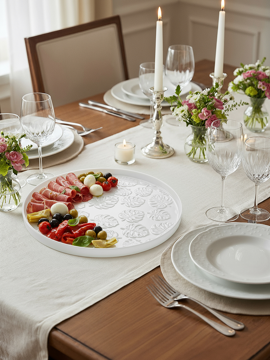Блюдо-поднос из серии «Тропики» от Elan Gallery предназначено для подачи разнообразных угощений. Размер изделия – 21х21х1,8 см, внутренний диаметр – 19,5 см. Выполнено из высококачественного белого фарфора. Он не впитывает цвет продуктов и легко отмывается, благодаря чему надолго сохранит свою белизну. Поверхность украшена рельефным узором в виде тропических листьев. Благодаря лаконичному, но изысканному дизайну посуда впишется в любой интерьер. Подойдёт для подачи сыра и колбасы, а также рыбных и мясных деликатесов. Красиво подайте на завтрак бутерброды из хлеба с нарезкой. Идеально подойдёт для сервирования закусок – суши, роллов и канапе, а также салатов, свежих фруктов и овощей. Наполните его десертами и сладостями, например, конфетами, печеньями, кусочки торта и пирога. Можно использовать в качестве декоративной подставки. Блюдо станет незаменимым элементом сервировки как в будни, так и на праздник. Не рекомендуется применять абразивные моющие средства. Можно использовать в посудомоечной машине и микроволновой печи. Поставляется в дизайнерской картонной коробке – благодаря ей вам не потребуется дополнительная подарочная упаковка. Фарфоровая сервировочная посуда будет оригинальным подарком для хозяйки, ценящей не только практичность, но и привлекательность. Серия «Тропики» от бренда Элан Галерея станет украшением любого кухонного инвентаря и позволит собрать красивый сервиз в едином стиле!