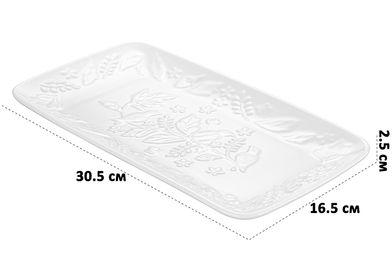 Сервировочное блюдо из серии «Птички на ветке» предназначено для подачи разнообразных угощений. Размер изделия – 30,5х16,5х2,5 см. Выполнено из высококачественного белого фарфора и украшено богатым рельефным узором: кайма обрамлена лиственными и цветочными элементами, а по центу располагается изящная лиственная веточка с маленькими птичками. Фарфор не впитывает цвет продуктов и надолго сохранит свою роскошную белизну. Благодаря лаконичному, но изысканному дизайну посуда впишется в любой интерьер. Подойдёт для подачи сыра и колбасы, а также рыбных и мясных деликатесов. Красиво подайте себе на завтрак бутерброды с хлебом и сырной нарезкой. Идеально подойдёт для сервировки закусок – суши, роллов и канапе, а также салатов, свежих фруктов и овощей. Наполните его десертами и сладостями, например, конфетами, печеньями, кусочками торта и пирога. Декоративное фарфоровое блюдо станет незаменимым элементом сервировки как в будни, так и на праздник. Не рекомендуется применять абразивные моющие средства. Можно использовать в микроволновой печи и посудомоечной машине. Поставляется в красивой картонной коробке – благодаря ей вам не потребуется дополнительная подарочная упаковка. Это идеальный подарок для хозяйки, ценящей не только практичность, но и стиль. Посуда из серии «Птички на ветке» преобразит вашу кухню и позволит собрать сервиз в едином стиле!