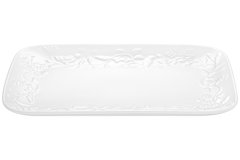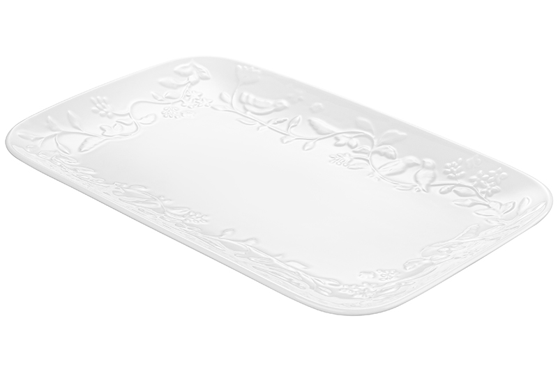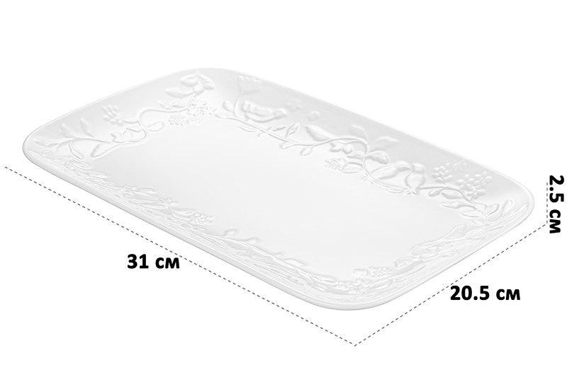 Прямоугольное блюдо Elan Gallery "Птички на ветке" размером 31х20,5х2,5 см выполнено из белого фарфора в классическом дизайне. Тарелочка подойдет для подачи рыбных, мясных блюд и закусок. Можно использовать для сервировки нарезки, овощей или фруктов для угощения большого количества гостей. Посуда серии украшена рельефным узором в виде фигурок птиц на изящных веточках. Эргономичная форма тарелки позволит использовать её как поднос. Удобно разместить на сервировочном блюде кусочки торта, пирога и другие сладости. Подойдёт для эстетичной подачи суши, роллов и бутербродов. Фарфоровая посуда отличается от керамической повышенной плотностью. Фарфор не впитывает цвет продуктов и не деформируется от влаги, чему может быть подвержена керамика. Избегать резких перепадов температур и беречь от механических повреждений. Не рекомендуется применять абразивные моющие средства. Можно использовать в микроволновой печи и мыть в посудомоечной машине. Поставляется в красочной картонной упаковке. Станет отличным подарком для любой хозяйки, которая ценит стильную сервировку. Понравится любителям посуды в скандинавском стиле. Серия "Птички на ветке" позволит собрать сервиз в едином стиле и станет украшением вашего дома.