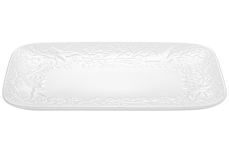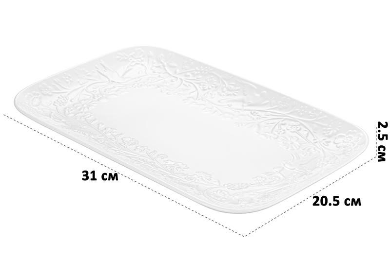 Прямоугольное блюдо из серии «Райский сад» от Elan Gallery предназначено для эстетичной сервировки вашего стола. Размер изделия – 31х20,5х2,5 см. Выполнено из высококачественного белого фарфора. Он не впитывает цвет продуктов и легко отмывается, благодаря чему надолго сохраняет свою белизну. Поверхность изделия овивают тонкие лиственные и цветочные веточки, возле которых порхают выразительные птицы. Тарелка подойдёт для подачи рыбных и мясных блюд, а также разнообразных закусок. Благодаря её вместительности можно красиво подать целую курицу, рыбу и любое другое мясо. Используйте для сервирования салатов, сырной нарезки, овощей и фруктов, чтобы угостить большое количество гостей. На сервировочном блюде удобно разместить кусочки торта или пирога, конфеты, зефир, а также другие десерты и сладости. Подойдёт для красивой подачи суши, роллов или бутербродов на завтрак. Благодаря лаконичному дизайну изделие впишется в интерьер любой кухни, столовой или гостиной. Не рекомендуется применять абразивные моющие средства. Подходит для использования в посудомоечной машине и микроволновой печи. Поставляется в дизайнерской картонной коробке – благодаря ей вам не потребуется дополнительная подарочная упаковка. Фарфоровая сервировочная посуда будет оригинальным подарком для хозяйки, ценящей не только практичность, но и привлекательность. Серия «Райский сад» от бренда Элан Галерея станет украшением любого кухонного инвентаря и позволит собрать красивый сервиз в едином стиле!