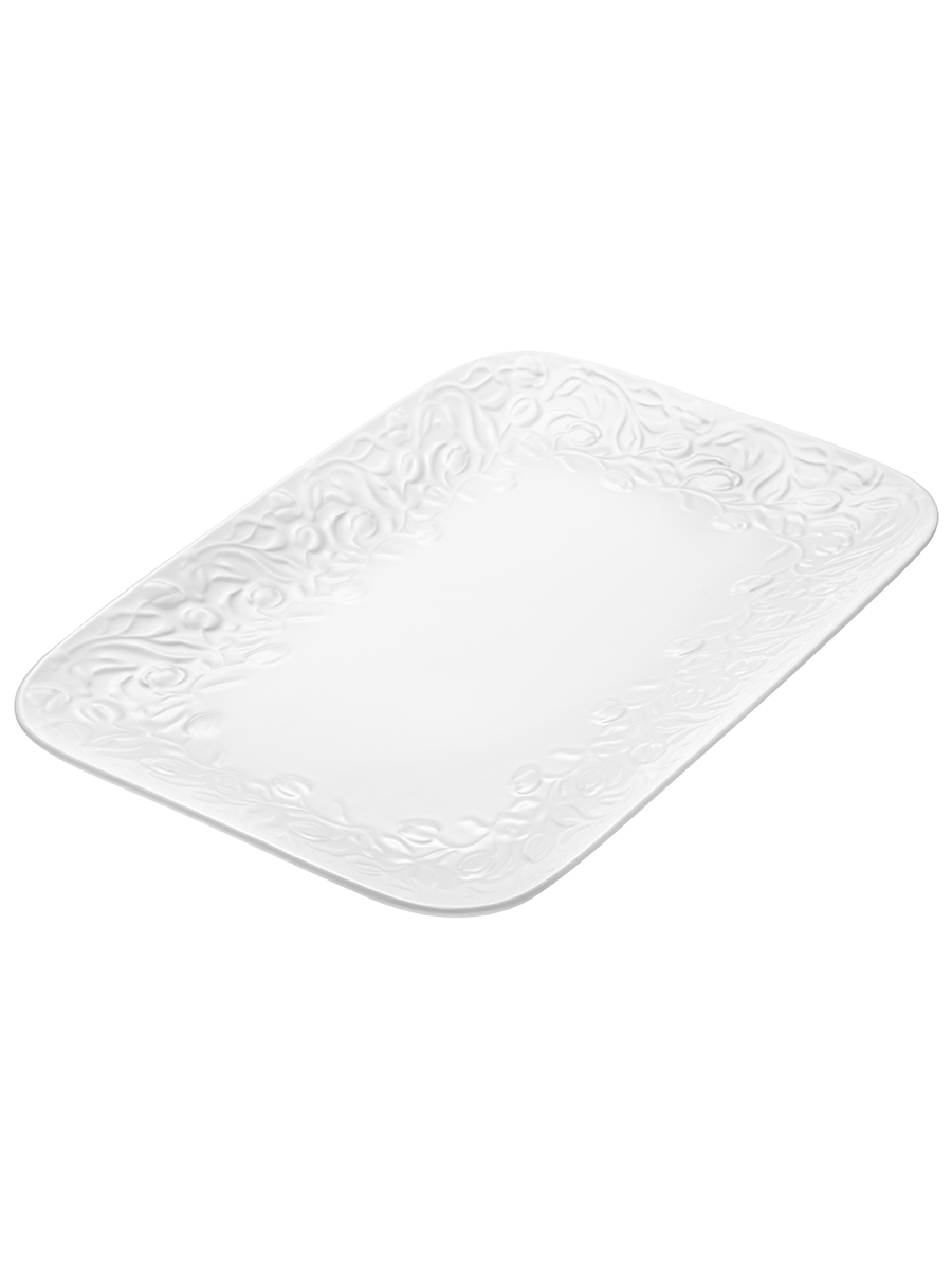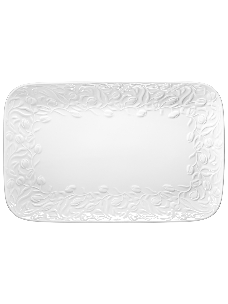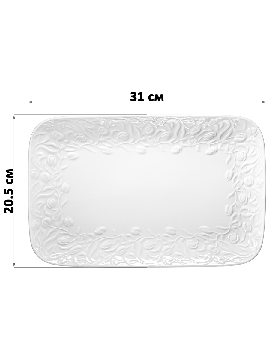 Прямоугольное блюдо Elan Gallery "Тюльпаны" размером 31х20,5х2,5 см выполнено из белого фарфора в классическом дизайне. Подойдет для подачи рыбных или мясных блюд. Можно использовать для сервировки нарезки, овощей или фруктов для угощения большого количества гостей. Посуда серии украшена рельефным узором с цветами. Эргономичная форма тарелки позволит использовать её как поднос. Удобно разместить на сервировочном блюде торт, пироги и другие сладости для угощения большого количества гостей. Фарфоровая посуда отличается от керамической повышенной плотностью. Фарфор не впитывает цвет продуктов и не деформируется от влаги, чему может быть подвержена керамика. Не рекомендуется применять абразивные моющие средства. Можно использовать в микроволновой печи и мыть в посудомоечной машине. Станет отличным подарком для ценителей стильной сервировки. Поставляется в картонной коробке. Благодаря коробочке с логотипом бренда не понадобится дополнительная подарочная упаковка. Особенно понравится любителям посуды в скандинавском стиле. Серия "Тюльпаны" позволит собрать сервиз в едином стиле и станет украшением вашего дома!