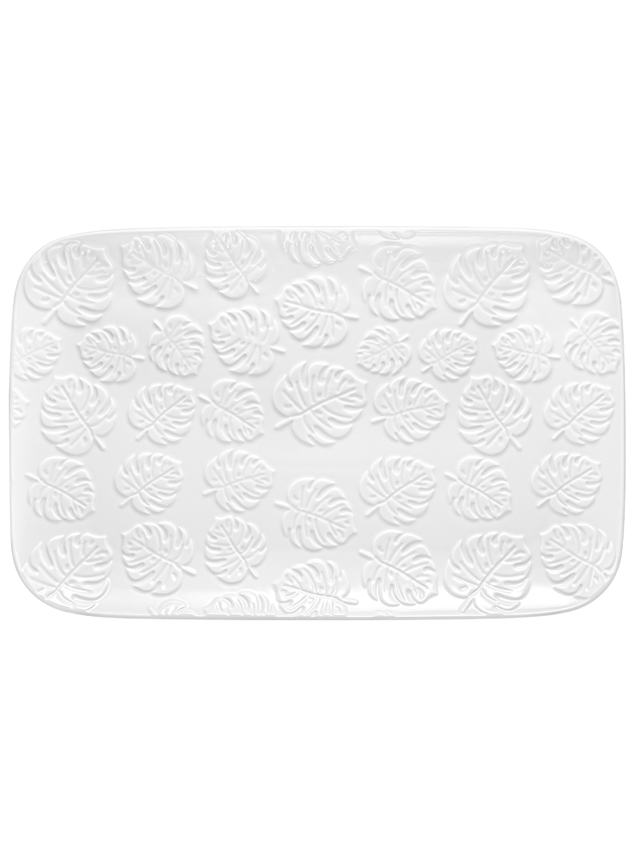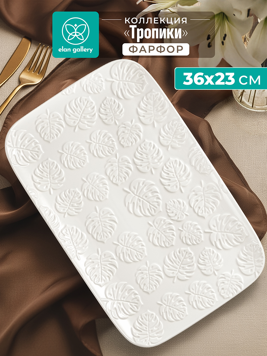 Блюдо из серии «Тропики» от Elan Gallery предназначено для эстетичной сервировки вашего стола. Размер изделия – 36х23х3 см. Выполнено из высококачественного белого фарфора. Он не впитывает цвет продуктов и легко отмывается, благодаря чему надолго сохранит свою белизну. Поверхность украшена рельефным узором в виде тропических листьев. Используйте прямоугольное блюдо для подачи сыра и колбасы, а также рыбных и мясных деликатесов. Красиво подайте на завтрак бутерброды из хлеба с сырной или мясной нарезкой. Идеально подойдёт для сервировки закусок – суши, роллов, канапе, а также салатов, свежих фруктов и овощей. Наполните его десертами и сладостями, например, печеньем, зефиром, кусочками торта или пирога. Блюдо станет незаменимым элементом сервировки как в будни, так и на праздник. Не рекомендуется применять абразивные моющие средства. Можно использовать в посудомоечной машине и микроволновой печи. Поставляется в дизайнерской картонной коробке – благодаря ей вам не потребуется дополнительная подарочная упаковка. Фарфоровая сервировочная посуда будет оригинальным подарком для хозяйки, ценящей не только практичность, но и привлекательность. Серия «Тропики» от бренда Элан Галерея станет украшением любого кухонного инвентаря и позволит собрать красивый сервиз в едином стиле!